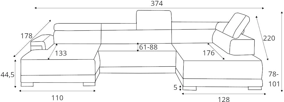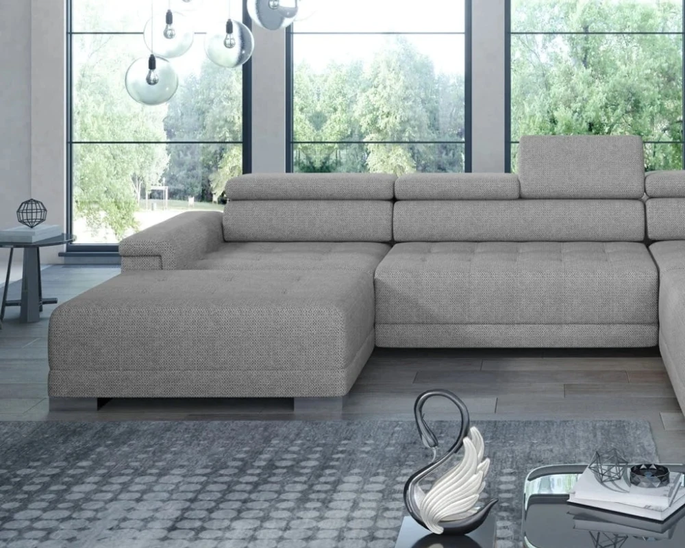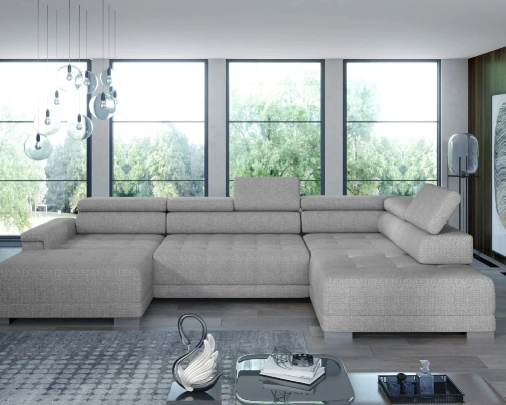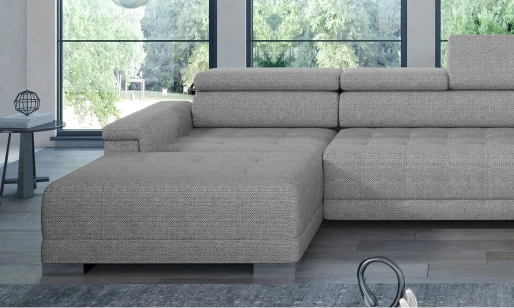 The Campo model from the Avangarde collection is an interesting proposition for both modern and classic interiors. It features a wide and spacious seat with decorative stitching, a sliding backrest with adjustable headrests, and electric seat depth adjustment instead of the typical sleeping function or bedding storage. The seat is filled with type A wave springs and N30 polyurethane foam. The backrest is filled with T1818 polyurethane foam. The back is upholstered. The black plastic legs are 5 cm high. The corner sofa is available in left- and right-hand versions. The model is available in Mini, L, and XL sizes.