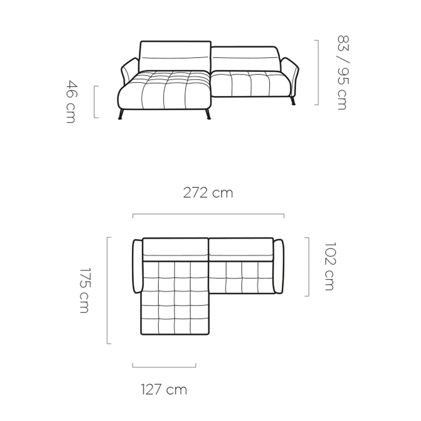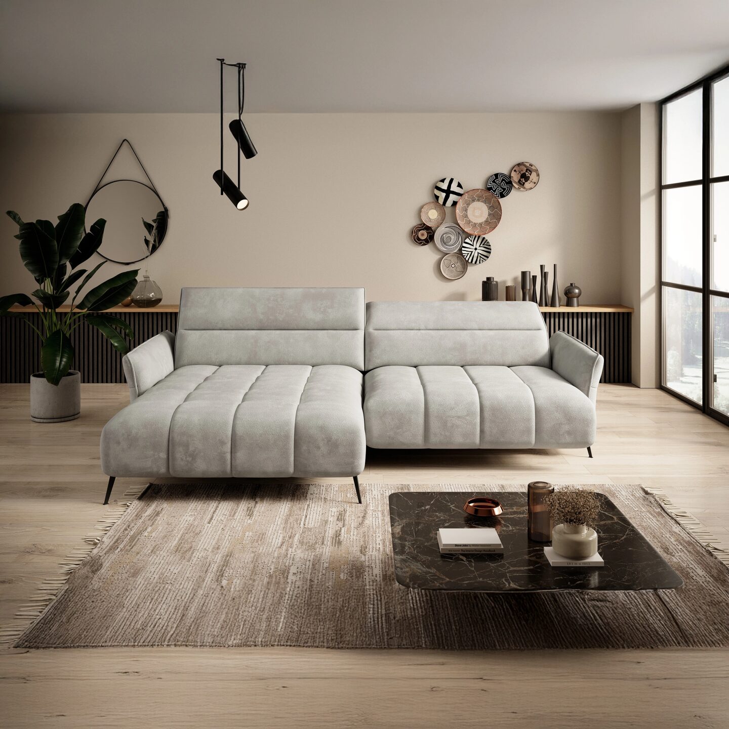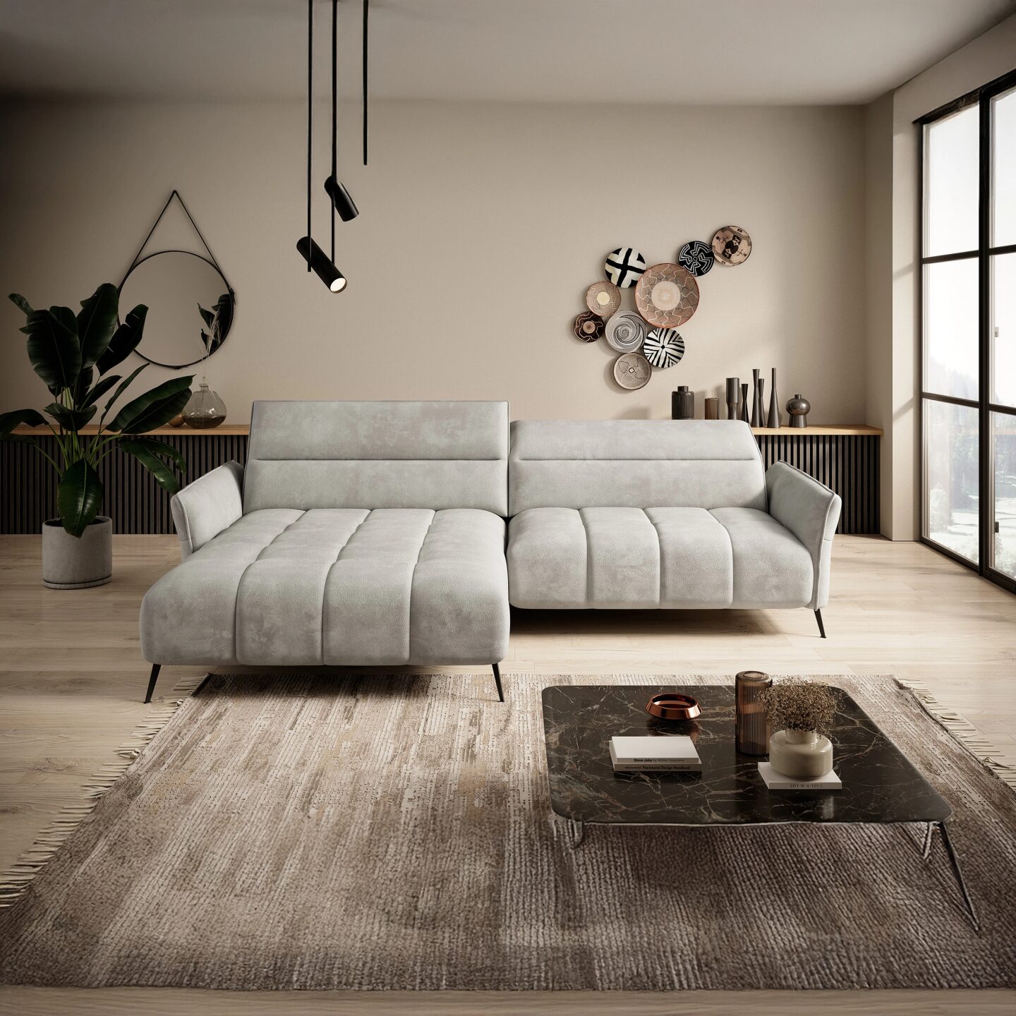 The Cavani corner sofa is a modern piece of furniture that combines elegance, functionality, and everyday comfort. Equipped with adjustable headrests, an electrically operated seat, and a sinuous A-spring system, it ensures maximum comfort and durability. Slender metal legs add a touch of lightness and elegance, while the freestanding structure makes it look stunning from every angle.