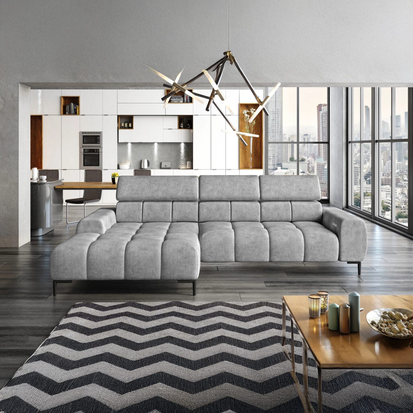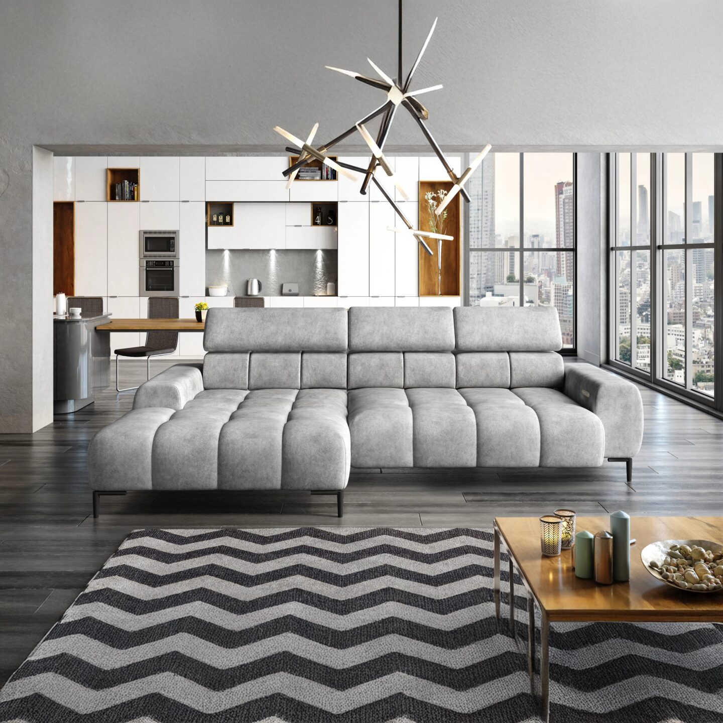 The PLAZA MINI corner sofa is a modern and elegant piece of furniture that combines minimalist design with maximum comfort. Equipped with a sliding backrest and adjustable headrests, it allows for individual seating position adjustments, ensuring the highest level of relaxation. Its solid pinewood, MDF, and plywood construction, sinuous springs, and N30 foam guarantee durability and comfort for years to come, while the 15 cm metal legs give it a light and modern feel.