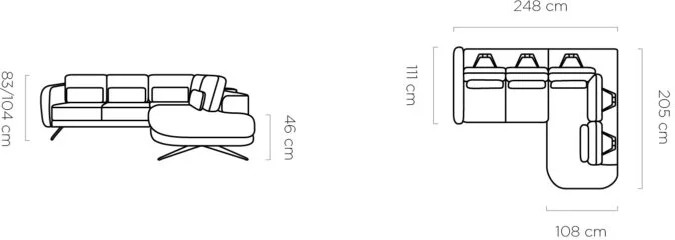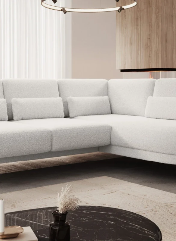 Thanks to its dimensions—248 cm wide, 205 cm deep, and 104 cm high—the Ilusio L corner sofa is perfect for medium-sized and larger living rooms, providing seating for three people. Its shape allows for efficient use of corner space, and the furniture’s harmonious lines complement modern and minimalist interiors. The lack of a bedding storage compartment or sleeping function means the corner sofa focuses on providing maximum comfort during daytime relaxation, and its presence in the living room promotes daily conversations, social gatherings, or quiet reading.