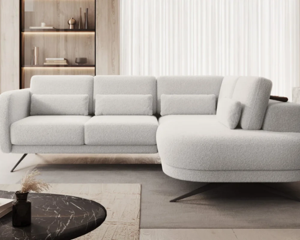 The Ilusio L is a corner sofa designed for modern interiors where both comfort and aesthetics are important. Its elegant fabric and subtle stitching on the cushions add a refined touch. The use of wooden elements in the furniture’s construction emphasizes its exceptional quality and durability. This piece can become the focal point of any living room, regardless of the chosen design style—from minimalist spaces to more cozy, homely interiors. The Ilusio L corner sofa is an excellent choice for those who value a combination of comfort, practicality, and stylish appearance.