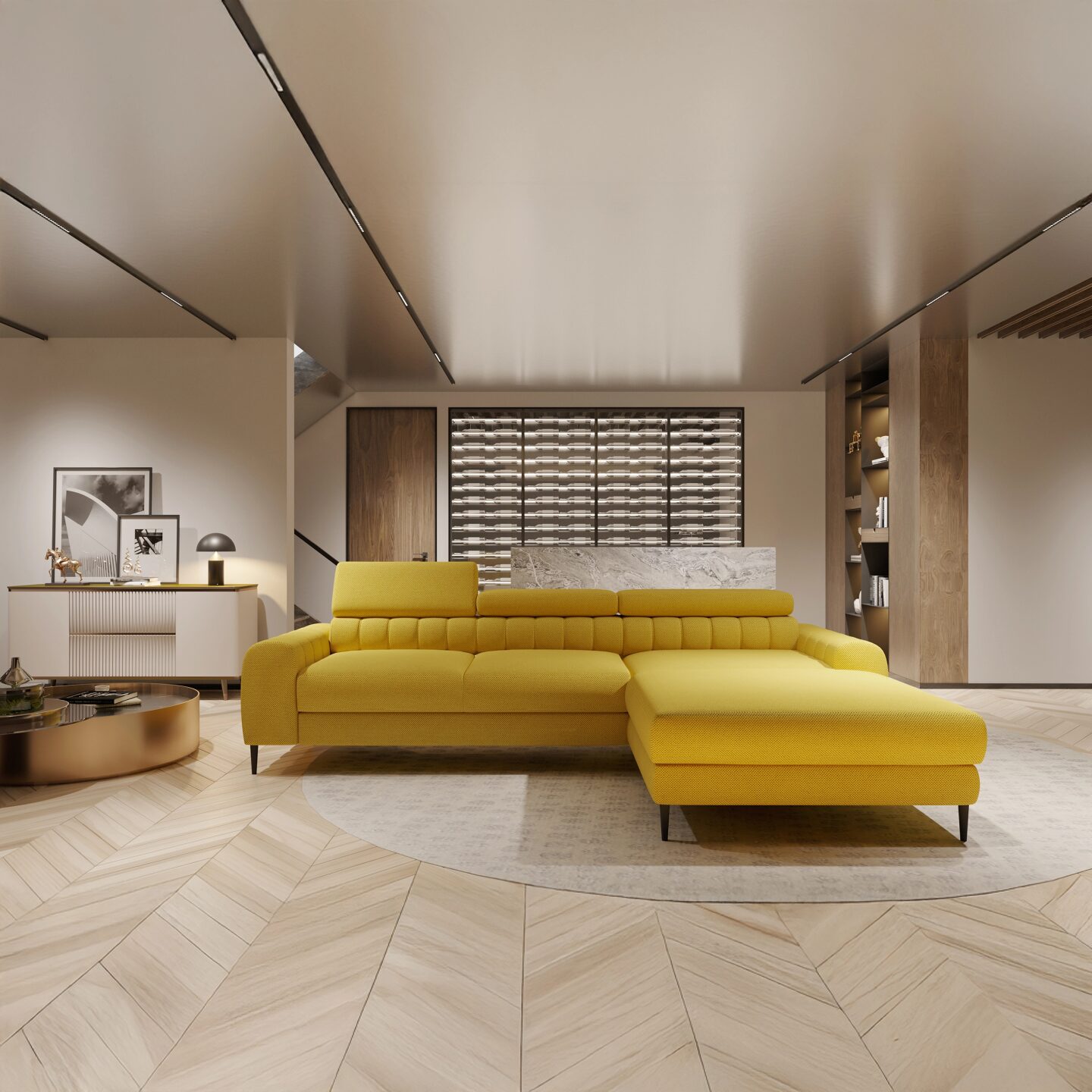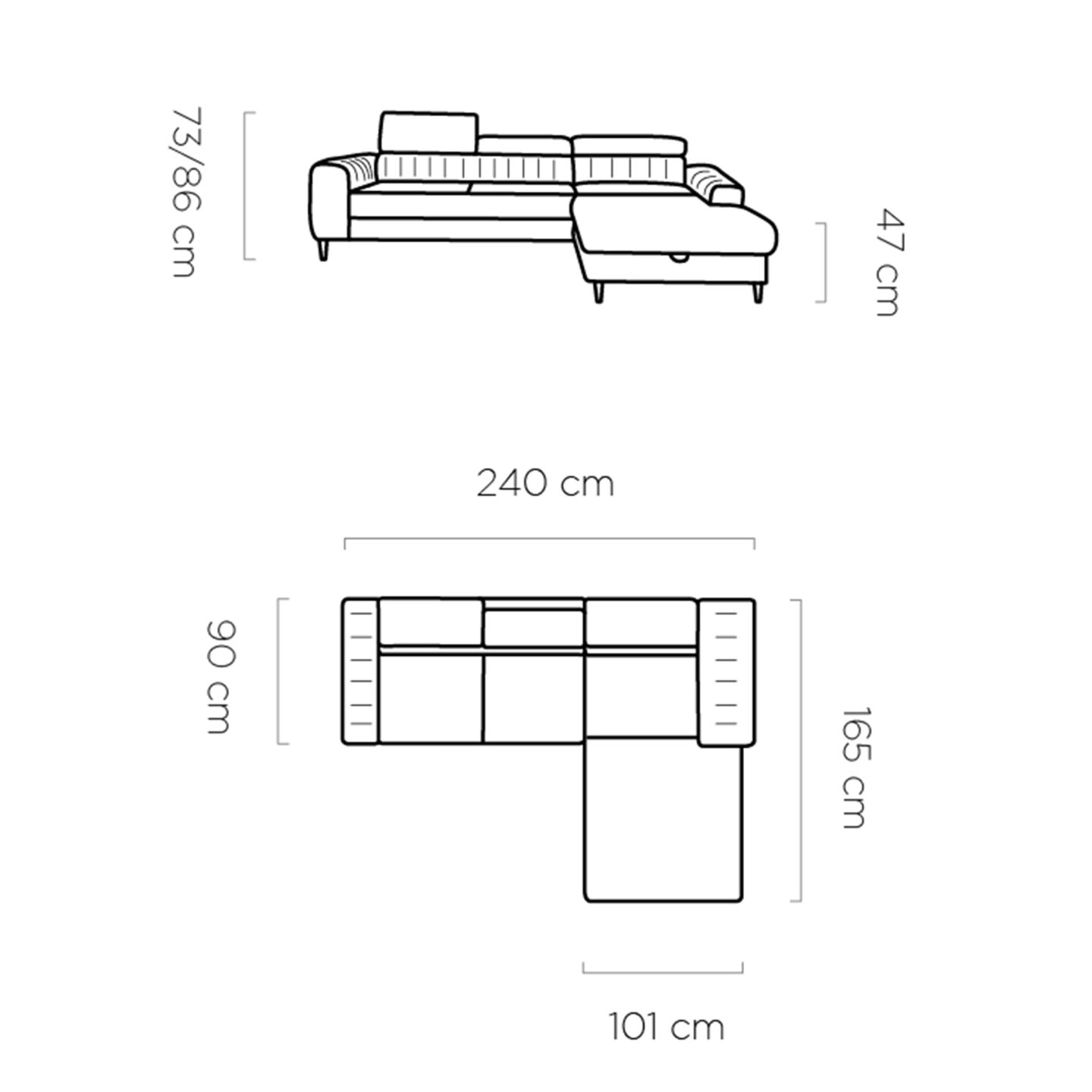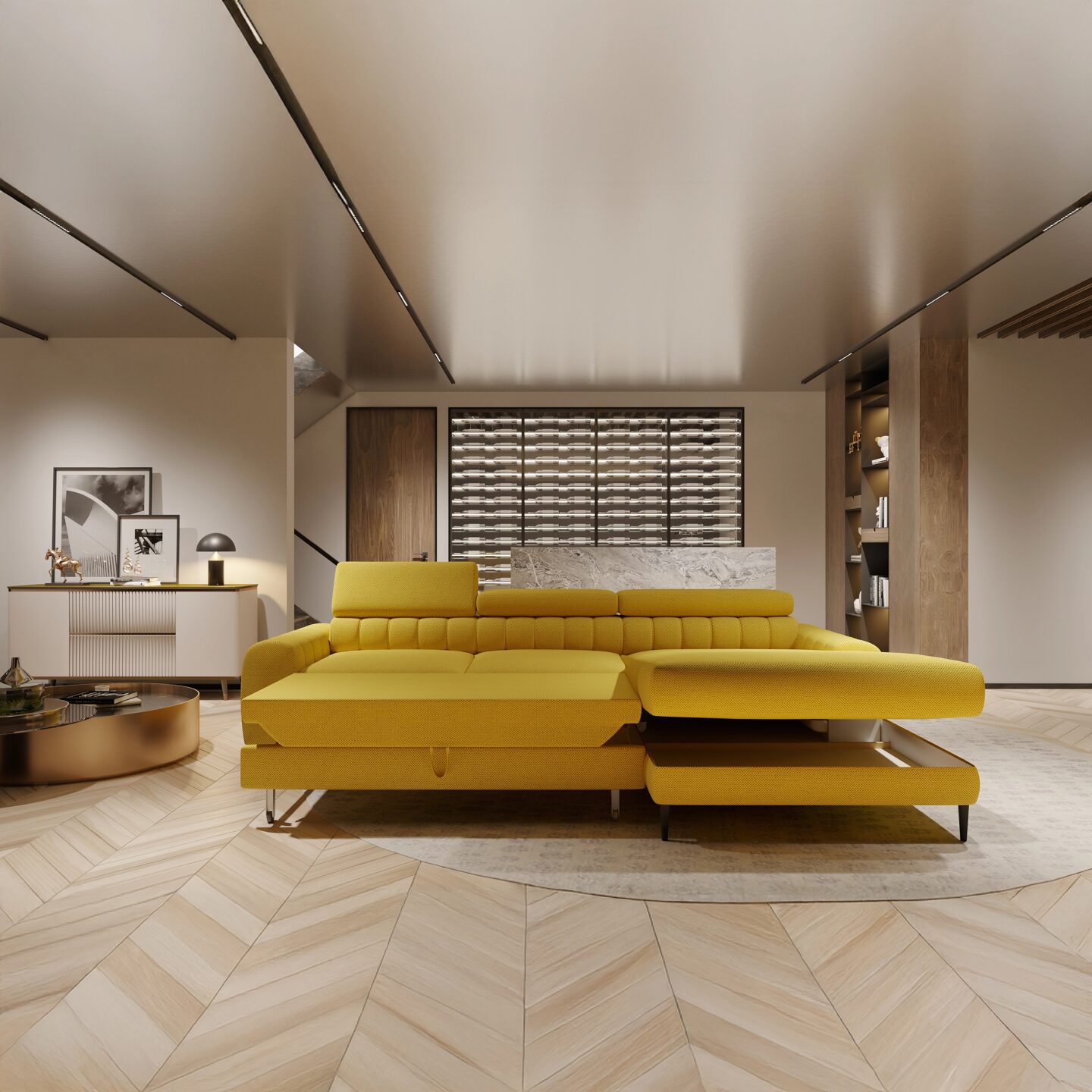 The Navas Mini corner sofa is an elegant and functional piece of furniture that combines modern design with maximum comfort. Equipped with a “Delphin” sleeping function, bedding storage, and three adjustable headrests, it’s a perfect addition to any living room. Its stable pinewood and MDF construction, combined with a type B sinuous spring and T-1818 foam, guarantees durability, while the 14 cm metal legs add a touch of lightness and modern style.