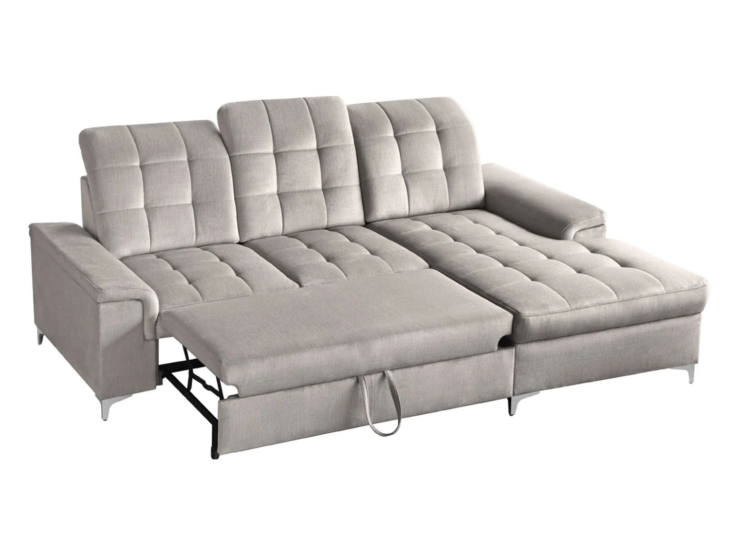 The Ariado Corner Sofa – the Perfect Choice for Any Interior. Bring elegance and functionality to your living room with the Ariado corner sofa. This modern piece combines a luxurious look with comfort and practicality, offering an ideal solution for both everyday use and entertaining guests. Comfort and Functionality: The Ariado right-hand corner sofa features a seat filled with high-quality foam and sinuous springs, guaranteeing optimal comfort and support during everyday use. The corner sofa also features a sleeping function, offering a spacious 140×200 cm bed, perfect for occasional overnight stays. Additionally, a practical bedding compartment allows for convenient storage of duvets and pillows, helping to keep your living room tidy. Practical Solutions: The Ariado corner sofa features a dolphin-type folding system, allowing for quick and effortless transformation into a bed. The solid construction and reliable mechanism ensure this corner sofa will serve you for many years to come. Velour upholstery adds a luxurious touch to the interior, while also being pleasant to the touch and easy to clean. Design and Style: Elegant embellishments in the form of stylish drawstrings give the corner sofa a unique look that perfectly complements modern interior designs. Simple lines and a minimalist design make this piece a perfect complement to any living room. The Voss 28 fabric used for the upholstery adds elegance and sophistication. Special Features: Right-hand corner sofa with a sleeping function, measuring 140×200 cm. Dolphin-style unfolding system – quick and easy unfolding. High-quality foam and sinuous springs in the seat – optimal comfort and support. Bedding compartment – additional storage space. Soft and elegant velvet upholstery – luxurious look and comfort. Stylish drawstrings – elegant and modern design. Summary: The Ariado right-hand corner sofa is an excellent choice for those seeking furniture that combines modern design, comfort, and functionality. Its elegant details, comfortable sleeping function and practical bedding container make it a perfect fit for any modern interior, adding style and luxury.
