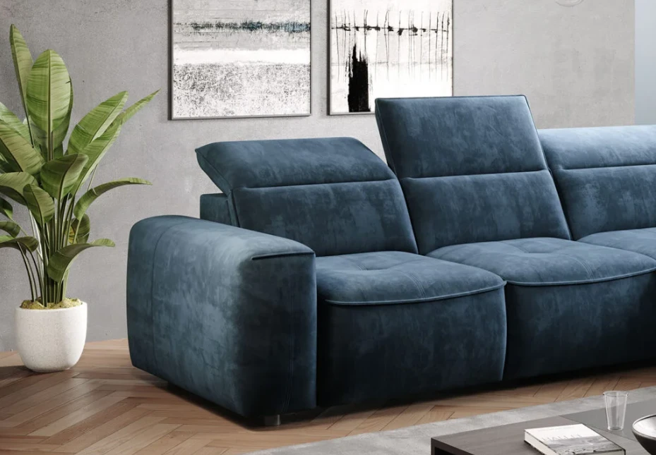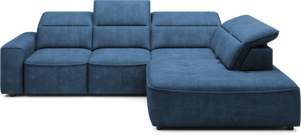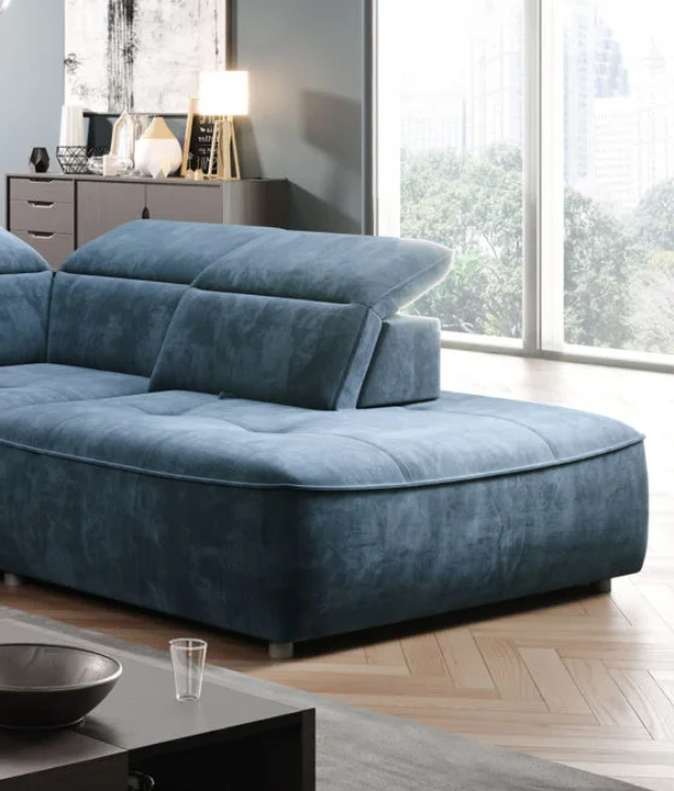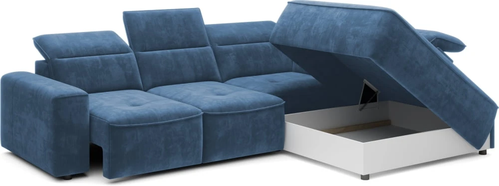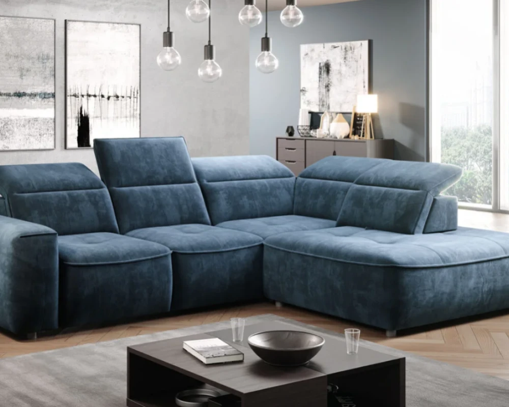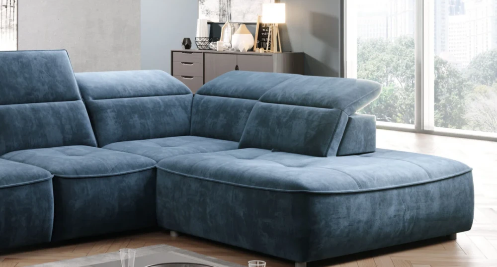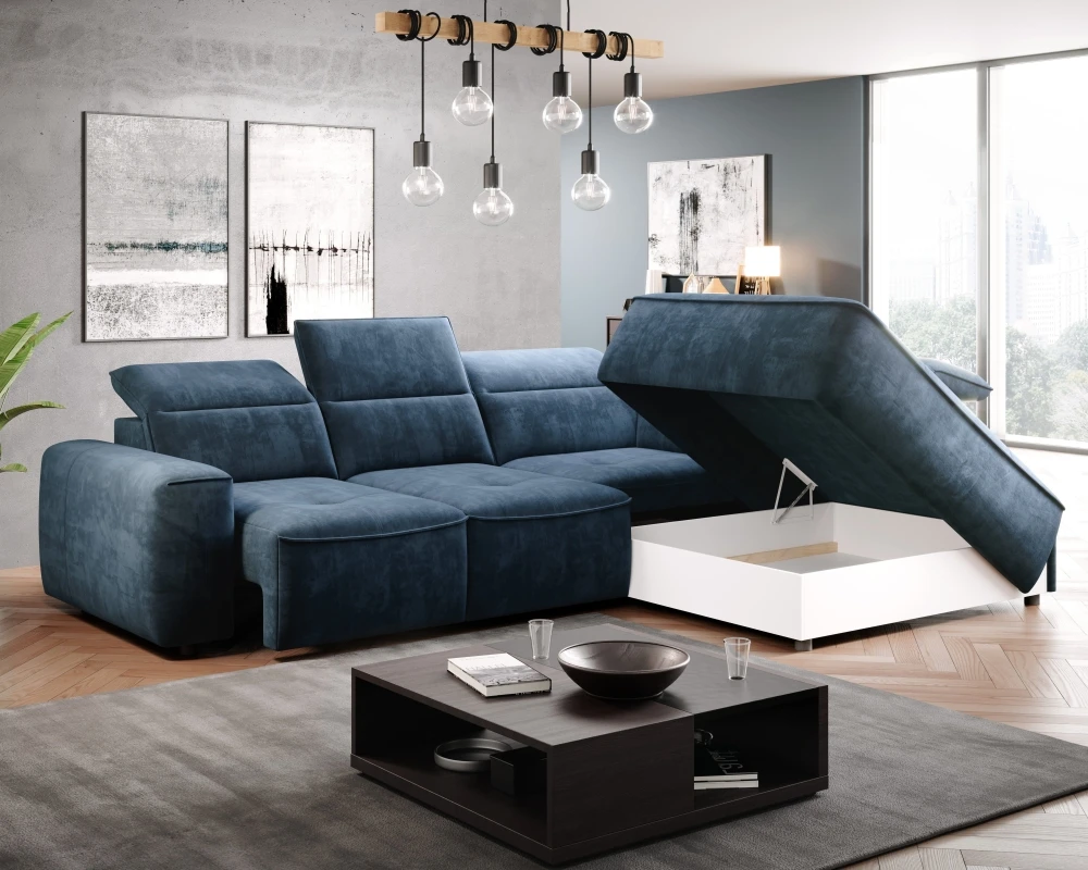 The Colombo corner sofa in the L version from the manufacturer Wersal, with an interesting shape and characteristic stitching, will be the perfect complement to any living room. It has an electrically extendable seat that can successfully replace the sleeping function (it unfolds to an area of ​​88×216 cm) and allows for comfortable rest. The seat is filled with type A wave springs and highly elastic polyurethane foam HR2515 and N30. The backrest is filled with polyurethane foam V2315 and an elastic belt. The furniture also has a spacious bedding container measuring 112x96x19 cm and movable headrests (5 pcs). Black plastic legs are 5 cm high. It is available in left- and right-hand versions. It is available in Mini, L, and XL versions.