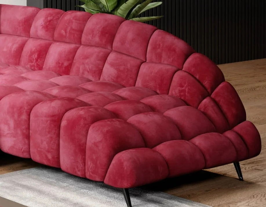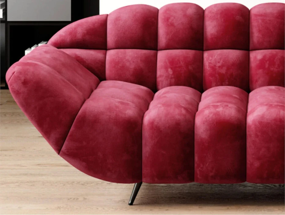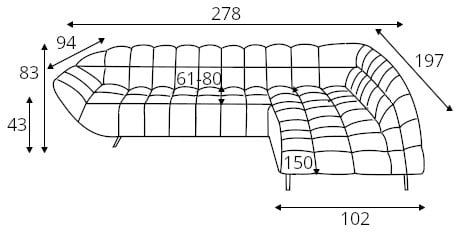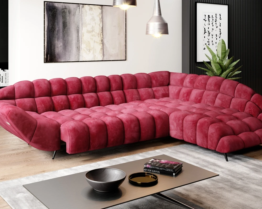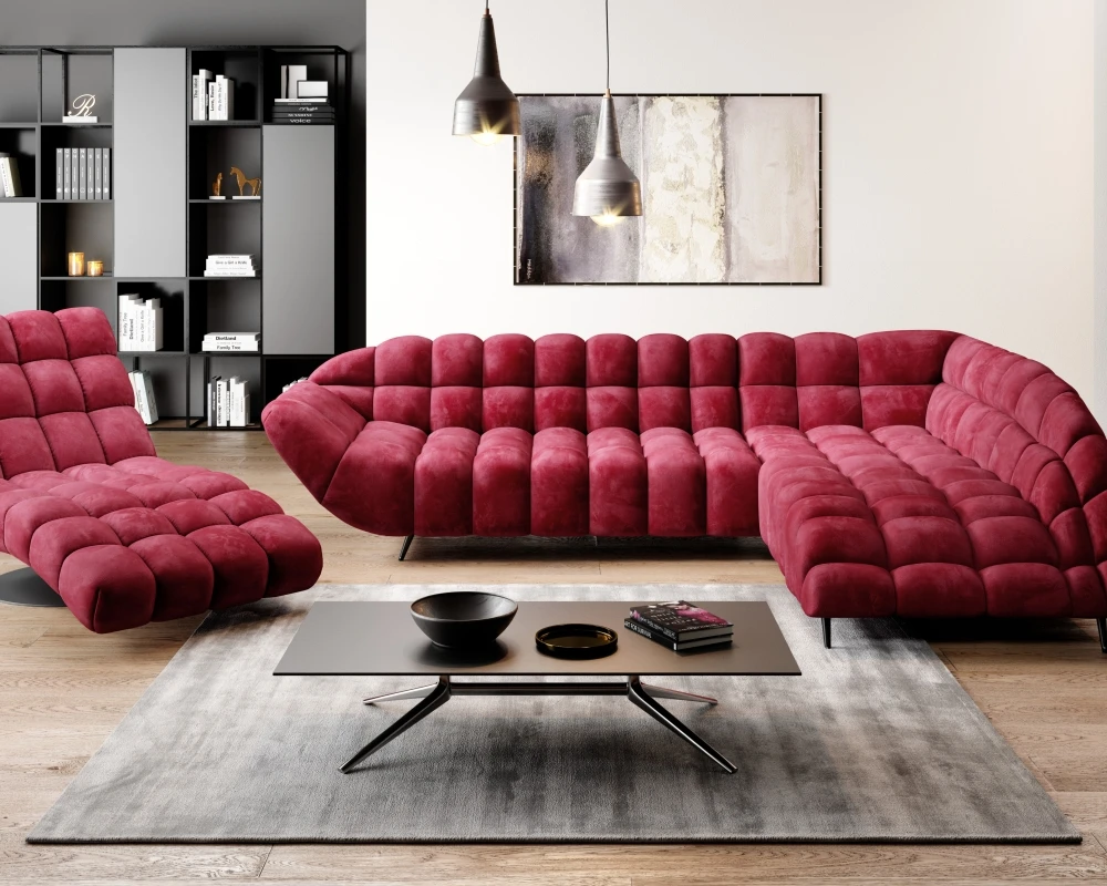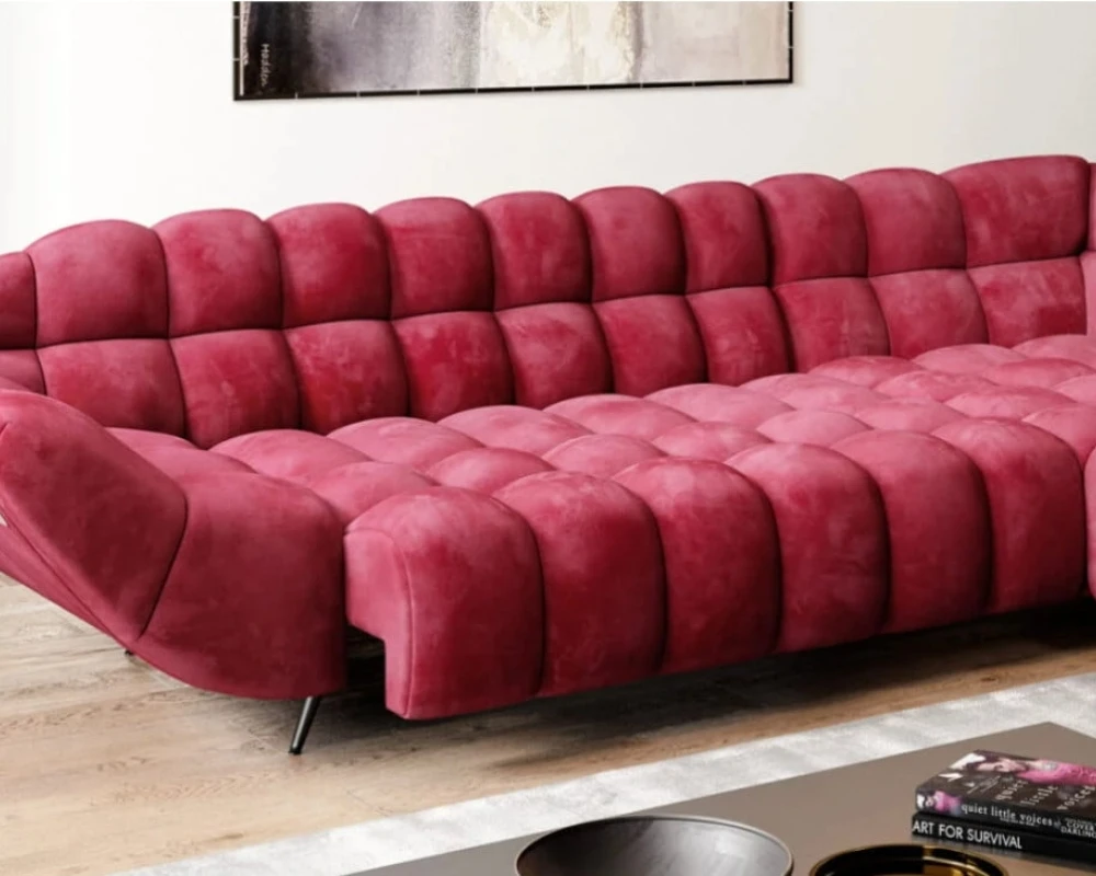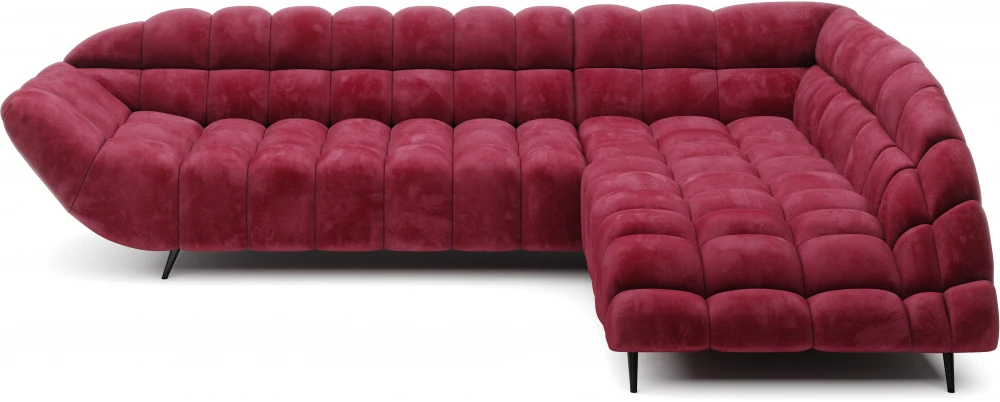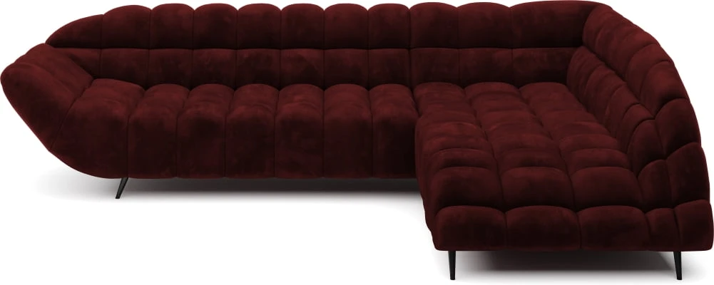 This striking Gappa corner sofa with decorative quilting measures 278x83x197 cm and is available in left- and right-hand versions. It features an electrically extendable seat, allowing for depth adjustment. The seat is filled with a type A wave spring and N30 and HR30040 polyurethane foam. The backrest is filled with V2315 polyurethane foam, HR30040 foam, and an elastic waistband. Tall, 15 cm metal legs accentuate the furniture’s lines, adding lightness and charm. The collection also includes a 2- and 3-seater sofa, and a pouffe.