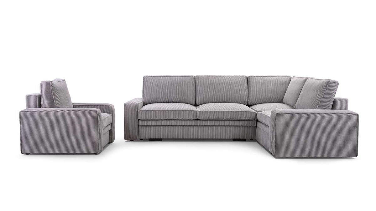 Back upholstered in your chosen fabric, 5 cushions, corduroy fabric.