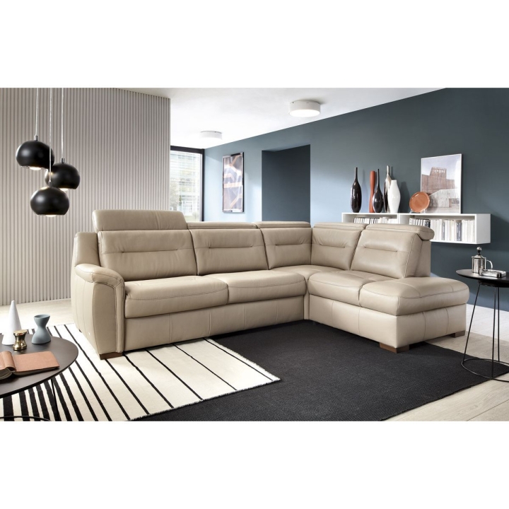 This model features high backrests with adjustable headrests, providing comfortable back and head support. Height adjustments from 93 to 107 cm allow for a customized fit. The upholstered back allows the corner sofa to be placed centrally in the room, not just against a wall.
