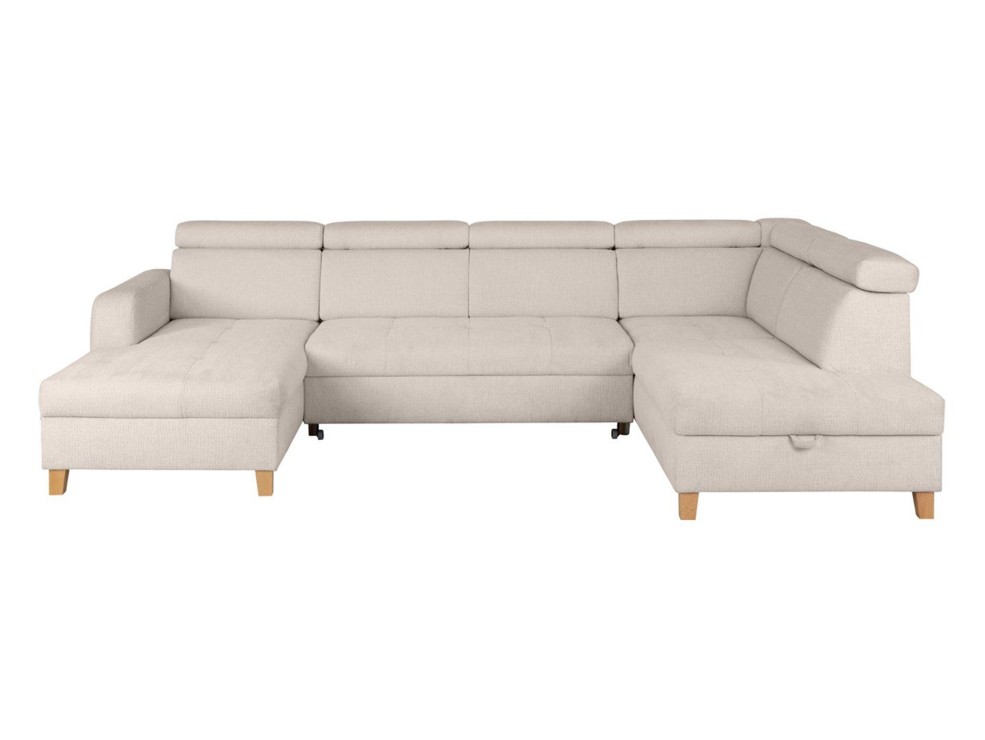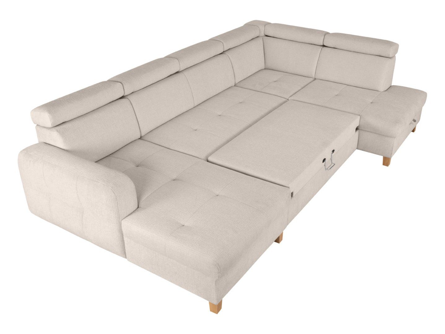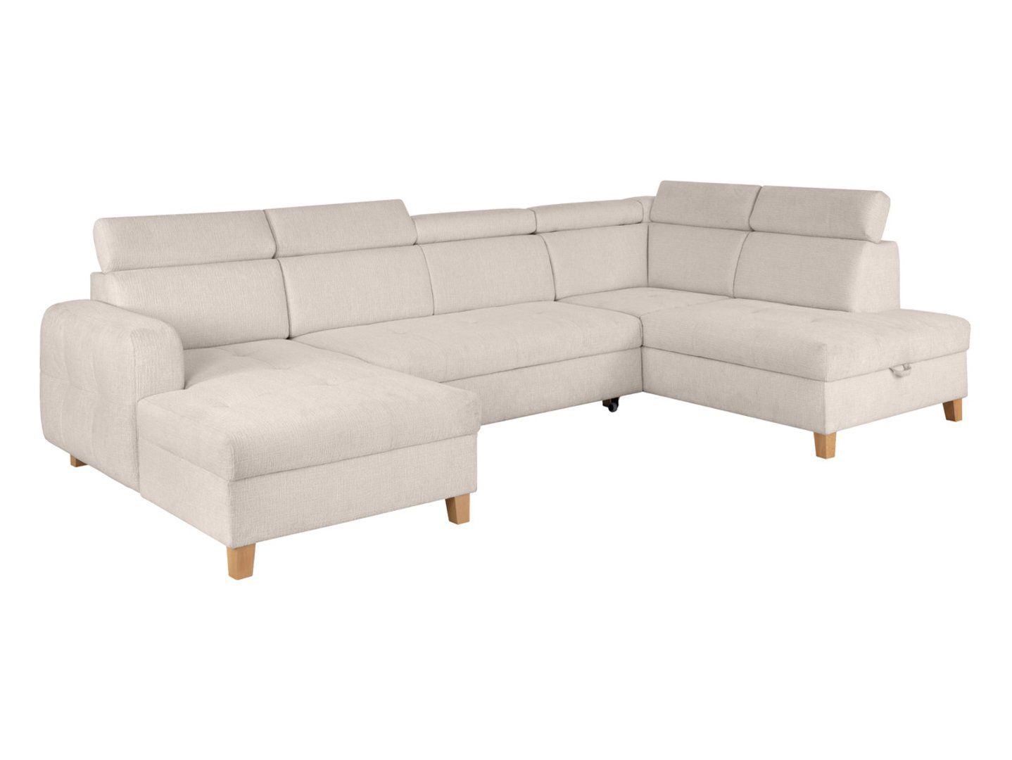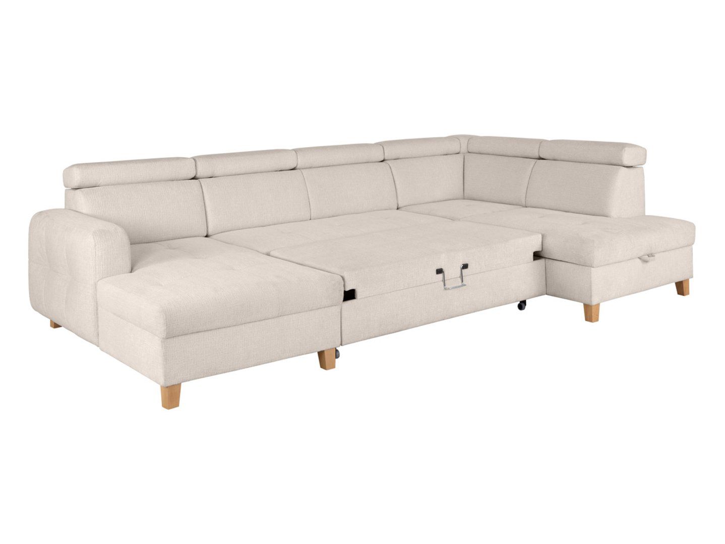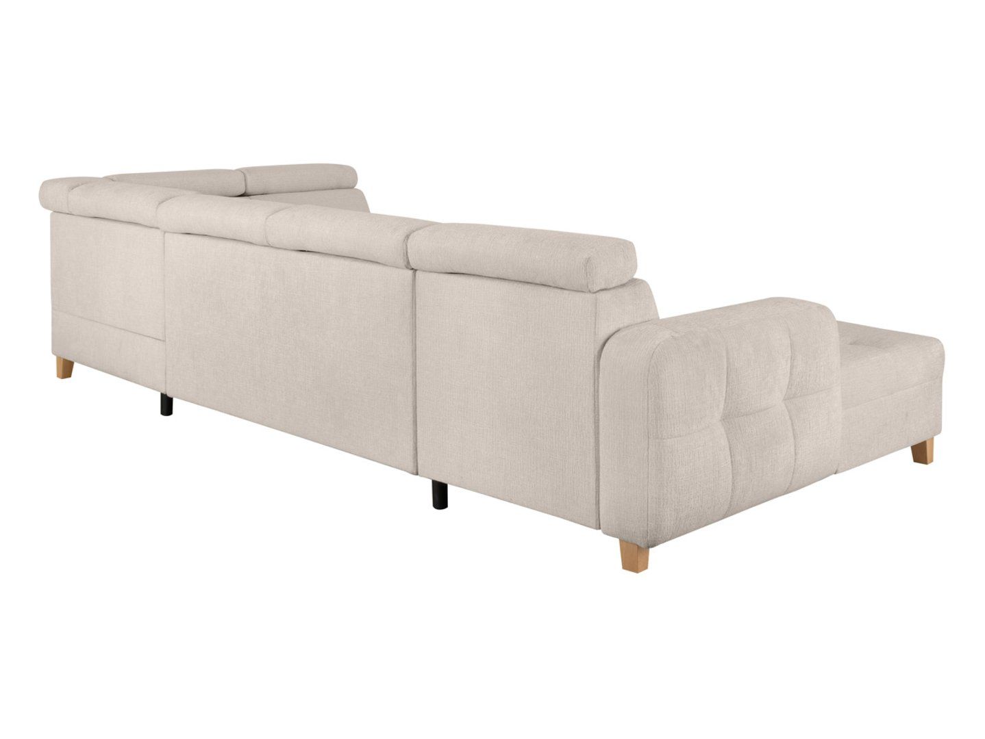The Saragossa Corner Sofa – a Space That Works for Your Comfort. Comfort and Functionality. If you’re looking for a corner sofa that provides maximum comfort for the whole family, the Saragossa will meet your expectations. A large seat, adjustable headrests, and high-quality foam filling guarantee comfort during everyday relaxation. The headrest height can be adjusted up to 97 cm, providing a comfortable base for both reading and relaxing in front of the TV. Practical Features. The Saragossa U corner sofa on the right has a dolphin sleep function that allows for quick and easy unfolding. The sleeping area of 132 x 271 cm is perfect for both guests and everyday use. An additional advantage is the spacious bedding compartment – a practical place to store blankets, pillows, and seasonal textiles. Design and Style. The beige Kansas 04 fabric gives the furniture an elegant look that complements interiors in modern, classic, or Scandinavian styles. Wooden legs in a natural beech color add visual lightness and a warm, homely touch. Wide armrests (22 cm) and a solid construction emphasize the high quality of workmanship and, at the same time, the practicality of everyday use. Special features: Dimensions: 331×206/174×89/97 cm (W x D x H) Sleeping area: 132×271 cm Sleeping function: dolphin mechanism Adjustable headrests: up to 97 cm high Filling: high-quality foam – comfort and elasticity Bedding compartment: practical storage Fabric: Kansas 04 – high-quality beige fabric Legs: wooden, natural beech Armrests: 22 cm wide Layout: right-handed in a U-shape Summary The Saragossa corner sofa is the perfect solution for large spaces where comfort, functionality, and aesthetics matter. Impressive dimensions, sleeping function, adjustable headrests, and high-quality materials make it a piece of furniture that will become the heart of your living room.