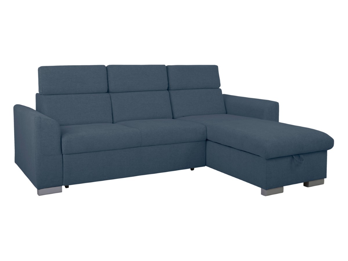 Evia universali kampinė sofa su miegojimo funkcija, indeliu ir reguliuojamais galvos atlošais, mėlyna