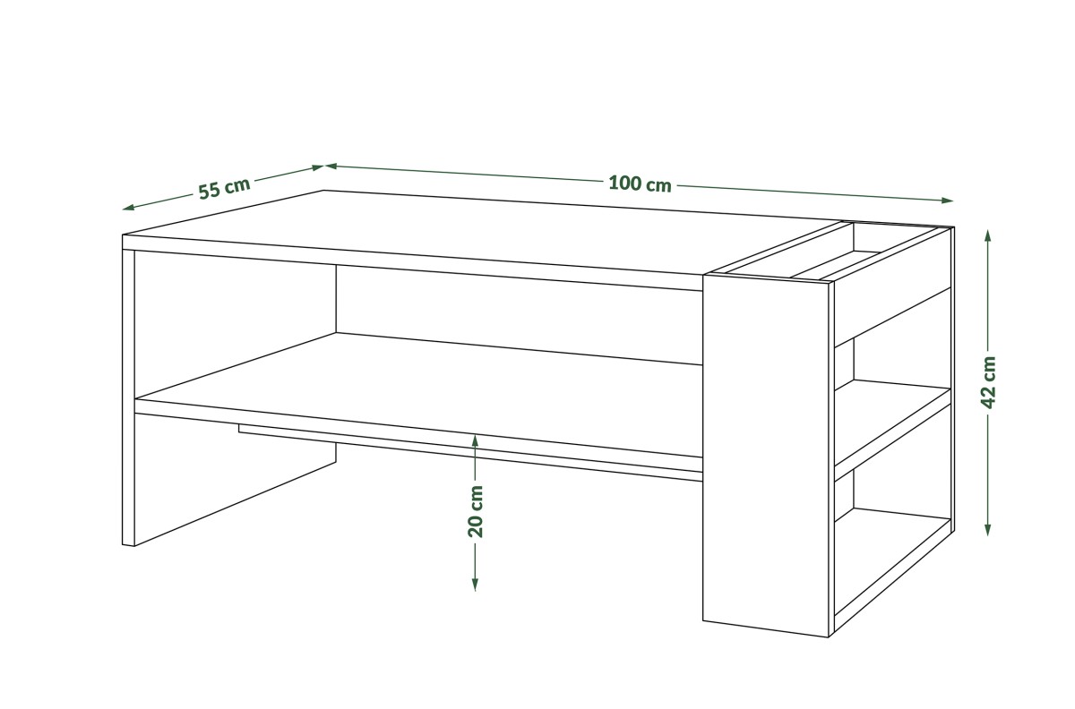 WIDTH 100 cm, DEPTH 55 cm, HEIGHT 42 cm, MATERIALS Particle board, SURFACE Matte, STYLE Modern, WEIGHT WITH PACKAGING 25 kg, OTHER Product designed for self-assembly with instructions provided