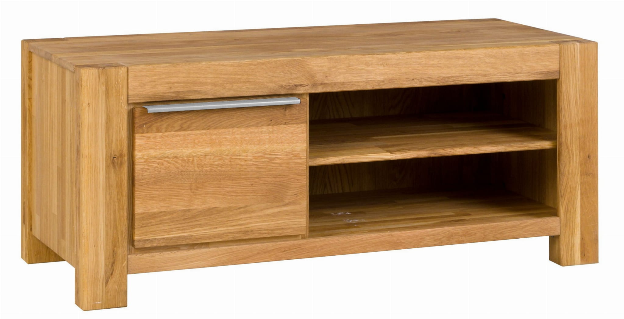 This modern-style TV stand with two doors and two open shelves is made of solid oak. The front, drawers, doors, and legs are made of solid oak veneer. The shelves, dividers, and sides are made of oak veneer. The oiled finish gives it a natural wood look.