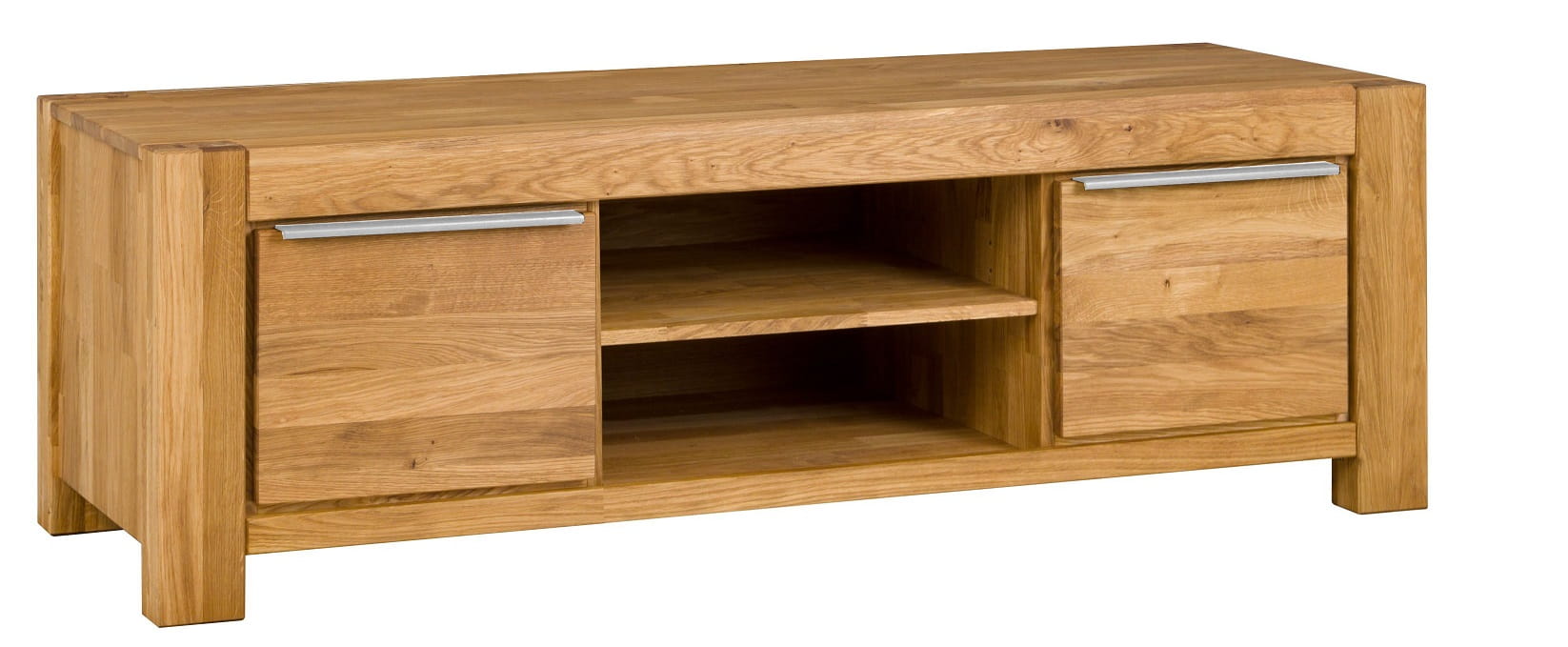 This modern-style TV stand with two doors and two open shelves is made of solid oak. The front, drawers, doors, and legs are made of oak veneer, while the shelves, dividers, and sides are made of oak veneer. An oiled finish gives it a natural wood look.