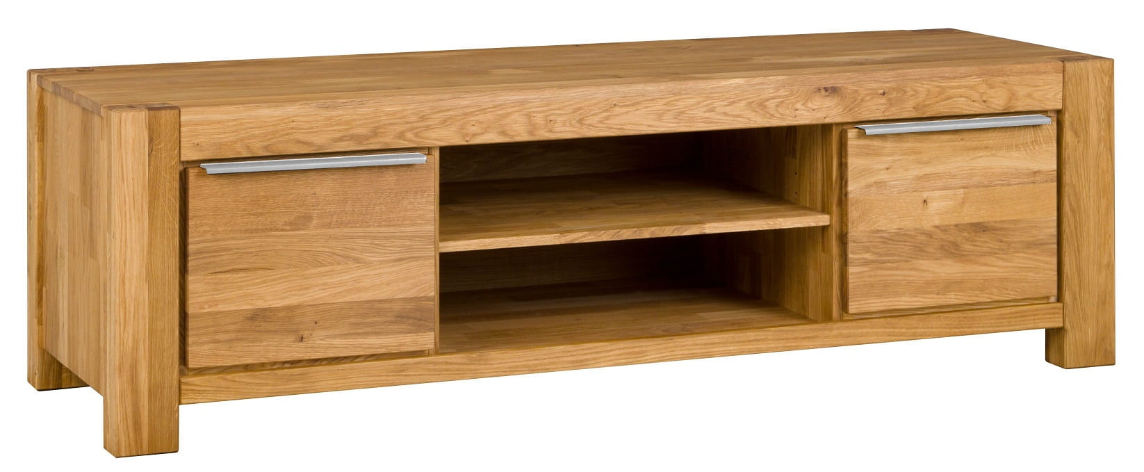 This modern-style TV stand with two doors and two open shelves is made of solid oak. The front, drawers, doors, and legs are made of solid oak veneer. The shelves, dividers, and sides are made of oak veneer. The oiled finish creates a natural wood look.