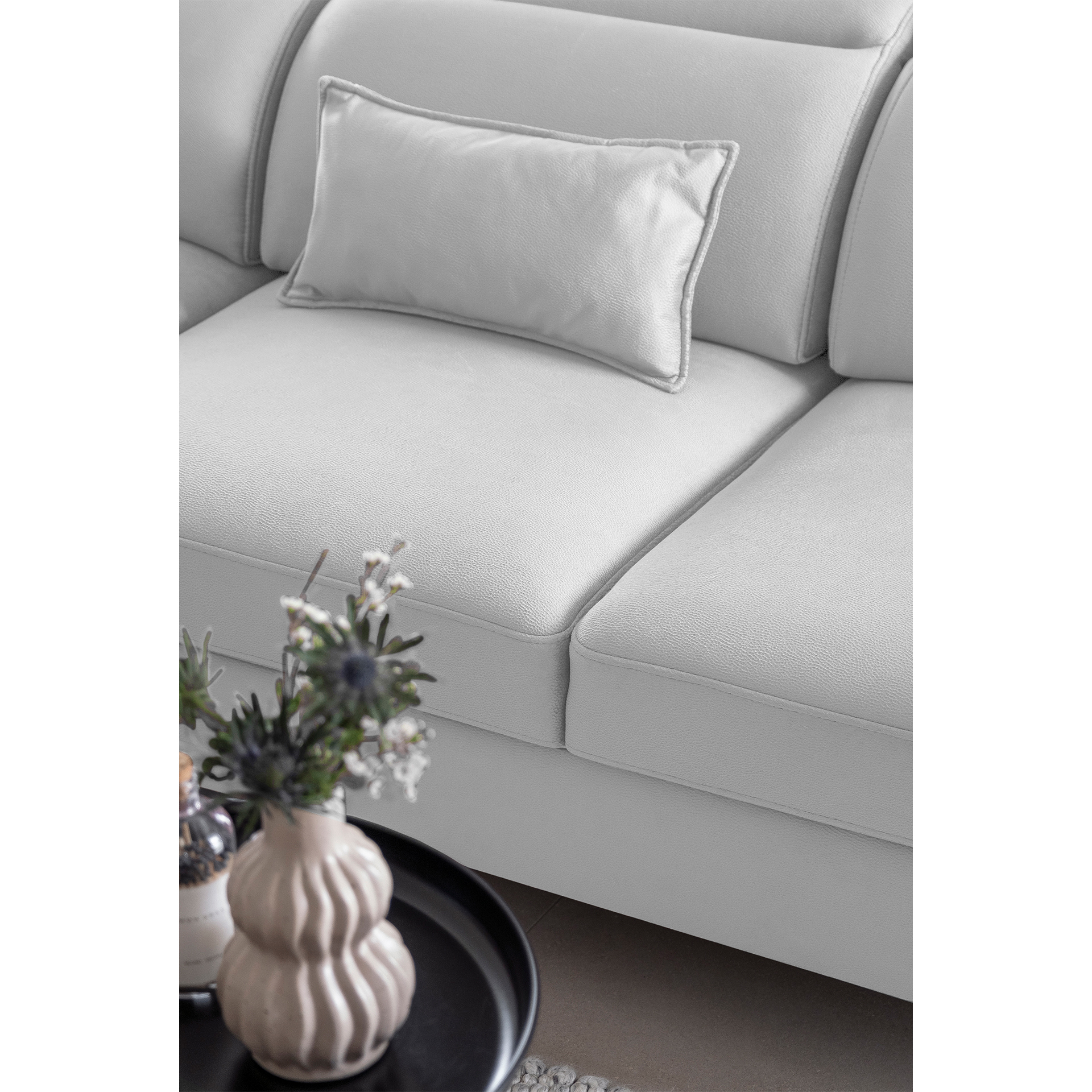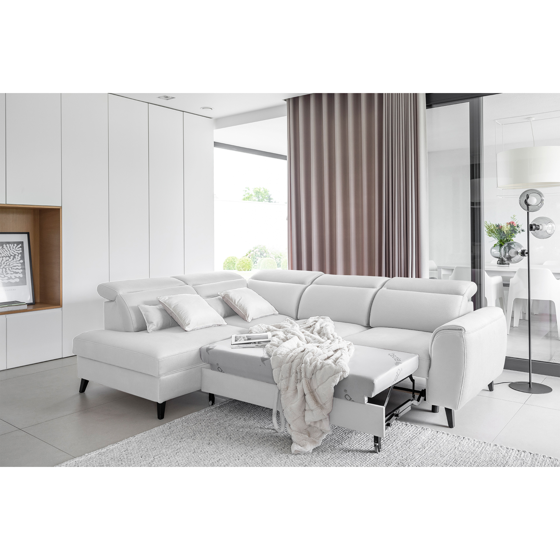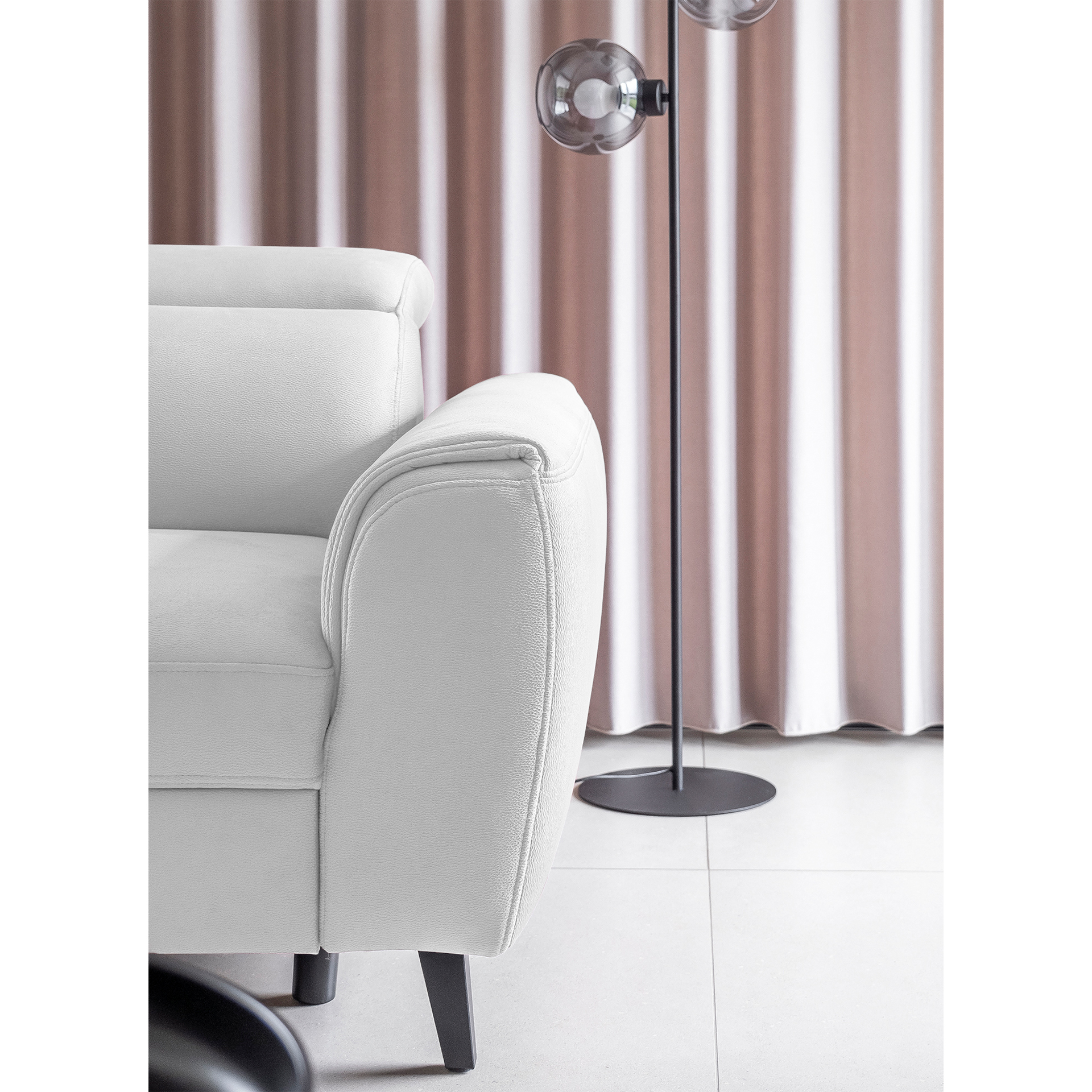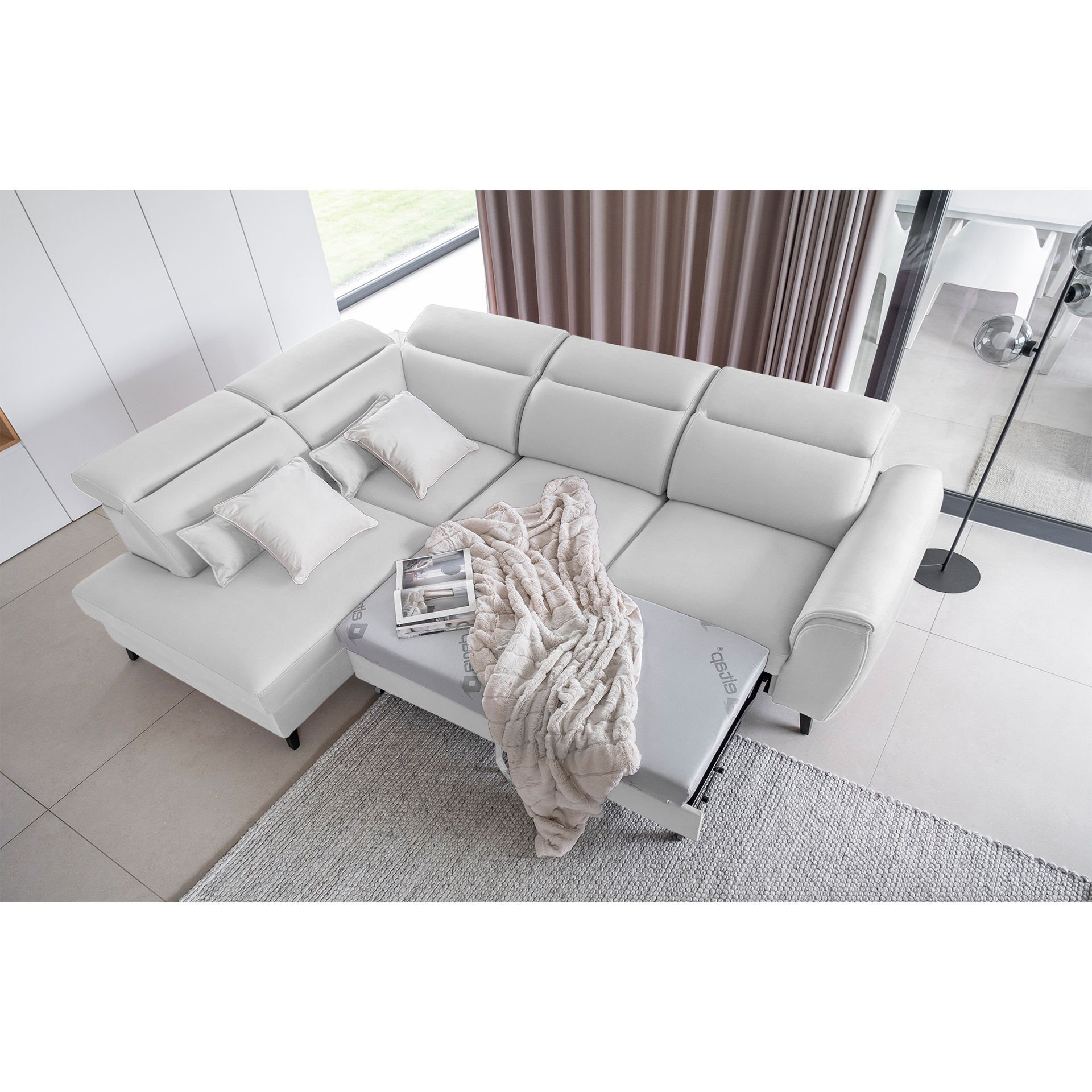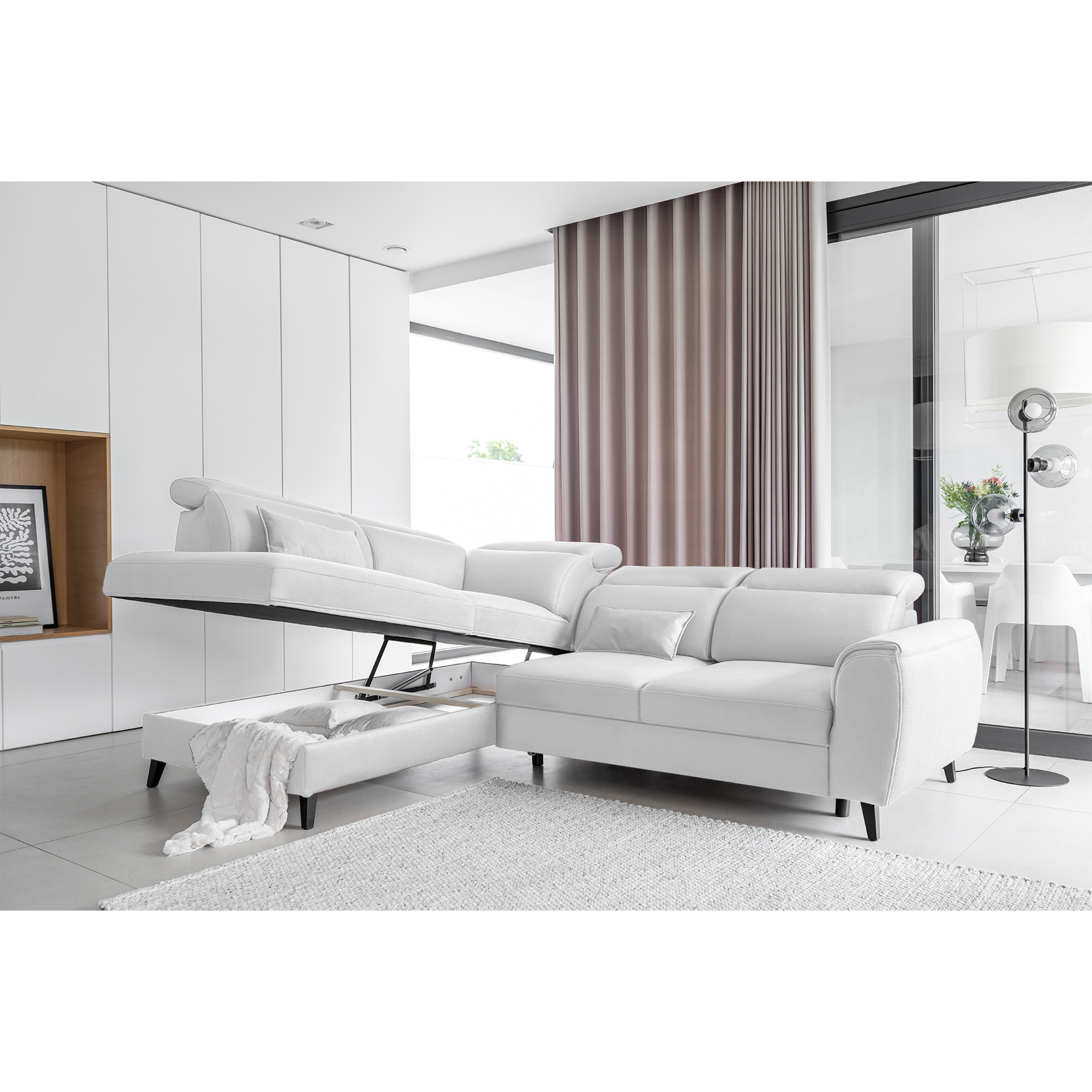 The Noble corner sofa is a functional, comfortable, and beautiful piece of furniture. Furthermore, this model is available in a wide range of upholstery options, including all fabrics available at BalduMarket. The Noble corner sofa is 255 centimeters wide, ensuring plenty of space for both family members and guests. Its other dimensions are 201 x 100 cm. It can also be used as a 120 x 195 cm bed thanks to its dolphin-type folding mechanism. Another advantage is the retractable caster wheel, which adds to the comfort of the Noble corner sofa. This extendable corner sofa also has a bedding compartment, perfect for storing spare duvets or pillows. It features a wooden frame, highly elastic HR foam, and a type B sinuous spring in the seat. The backrest of the Noble corner sofa features an upholstery belt, typical of modern upholstered furniture. The 13 cm high wooden black legs are a treat for robot vacuum owners. Our corner sofas are designed with comfort and durability in mind. That’s why the Noble Corner Sofa features five adjustable headrests to help you rest and relax comfortably.