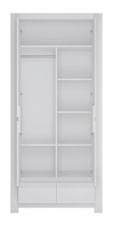 Be amazed by the functionality and subtle design of the Novi NVIS02 – 2-D2S White Wardrobe. This piece of furniture will easily fit into a variety of interior designs, providing not only essential storage space but also enhancing the modern character of the room. Its dimensions – width 92 cm, height 198.5 cm, and depth 58.2 cm – allow for ergonomic use of available space. This wardrobe from the Novi collection features a unique, handleless system, giving its form a uniform and elegant appearance. It’s a perfect choice for both a youth room and a living room where aesthetics and minimalism are particularly valued. The wardrobe’s interior has been designed for maximum functionality: on the left side is a practical rail for hanging clothes, while on the right are shelves ideal for organizing clothes and other items. Two spacious drawers provide additional storage space, perfect for organizing linens and smaller accessories. The fronts are made of MDF board, covered with high-quality PVC foil, ensuring an aesthetically pleasing appearance and long-lasting durability against everyday wear and tear. The wardrobe body, in turn, is made of solid laminated chipboard, offering high resistance to scratches, mechanical damage, moisture, and high temperatures. The white finish will not only brighten the interior but also facilitate matching it to a diverse palette of colors and patterns in your home.
