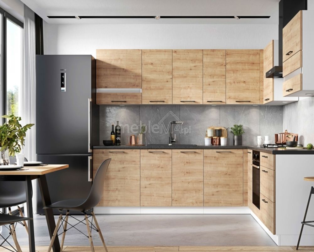 Kitchen specification – white, shades of wood | Kitchen style – modern | Front type: Laminated board / MDF / Lacquer laminated board 16 mm | Dimensions: width [cm]>56.4 height [cm]>223.3
