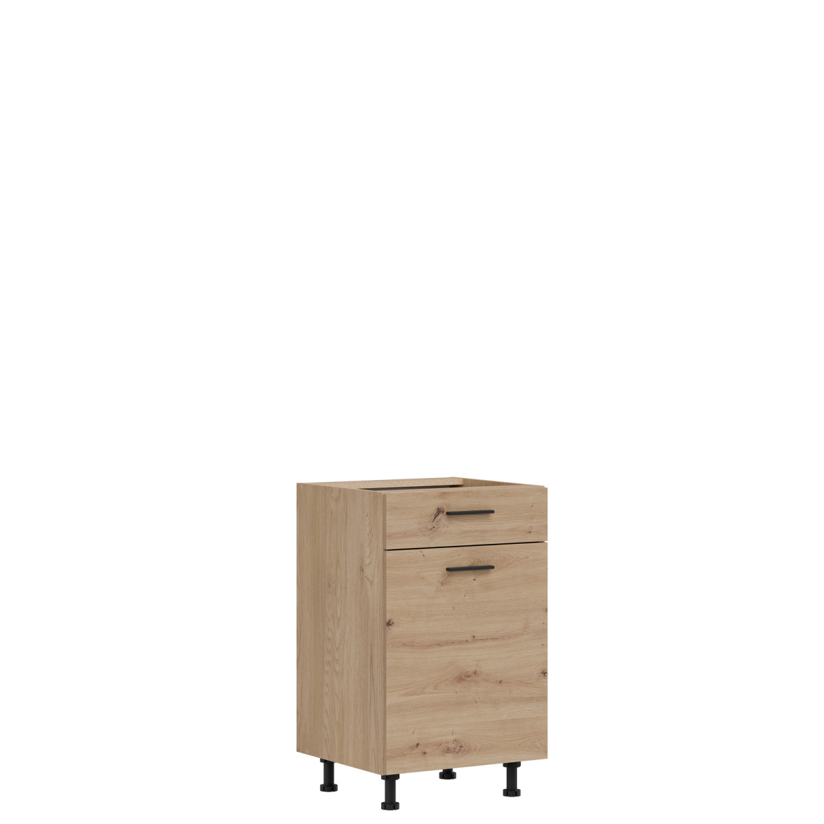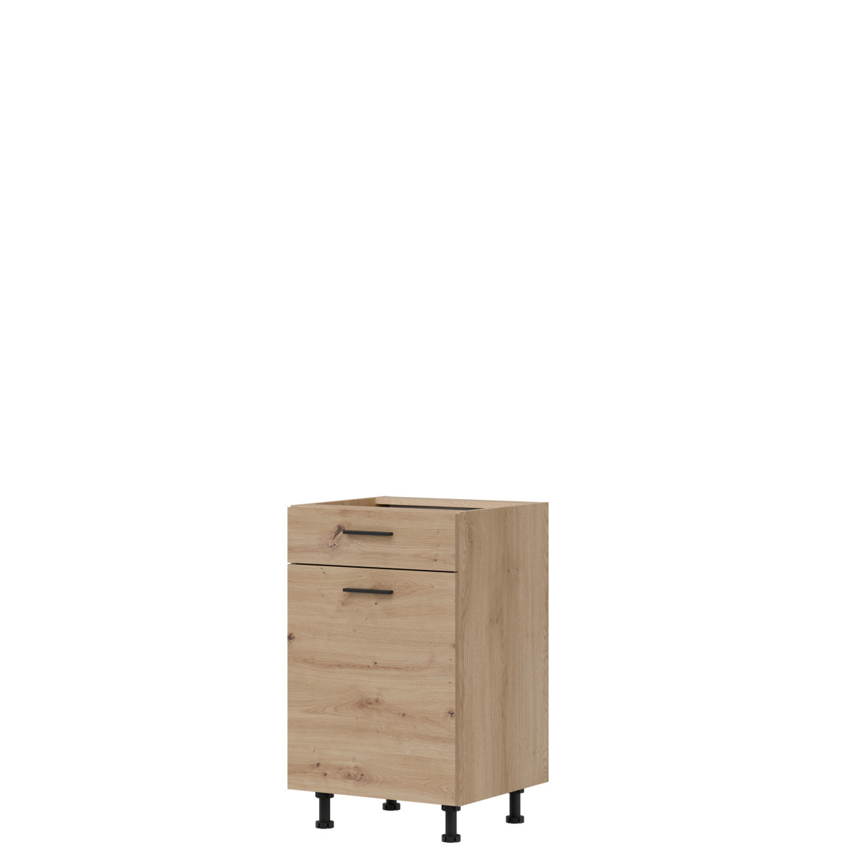 Width 50 cm Depth 46.3 cm Height 82 cm Product weight with packaging 20.25 kg Manufacturer’s code / symbol PK15/PF16 Collection name PATI Number of product packages 2 Style Modern Equipment Assembly instructions / assembly accessories Assembly For self-assembly Body color Cremona Torro Oak Body material / type / thickness 16 mm furniture board Body bottom material / type / thickness 16 mm furniture board Shelf color Cremona Torro Oak Shelf material / type / thickness 16 mm furniture board Shelf quantity 1 Back wall material / type / thickness 2.5 mm HDF furniture board Back wall visible part color White Front available colors Cashmere, Cremona Torro Oak, Artisan Oak, Light Graphite Front material / type / thickness 16 mm furniture board Front hinge ⌀ 35 mm adjustable in three positions Front universal opening left / right YES Front handle / finish / color Plastic / black Soft-close door system Standard Soft-close drawer system Optional Leg / finish / color Adjustable / plastic / Black Leg height 100 mm Number of doors 1 Number of drawers 1 Number of closed niches 2