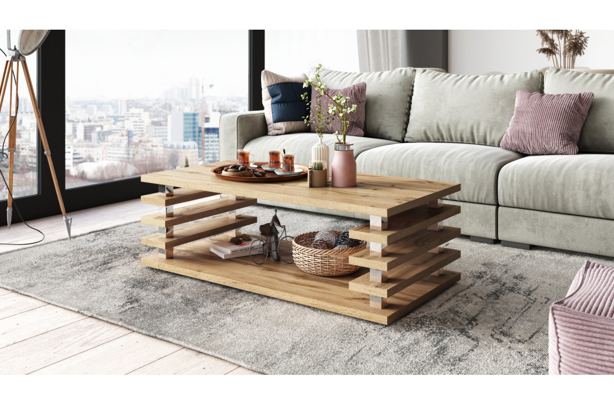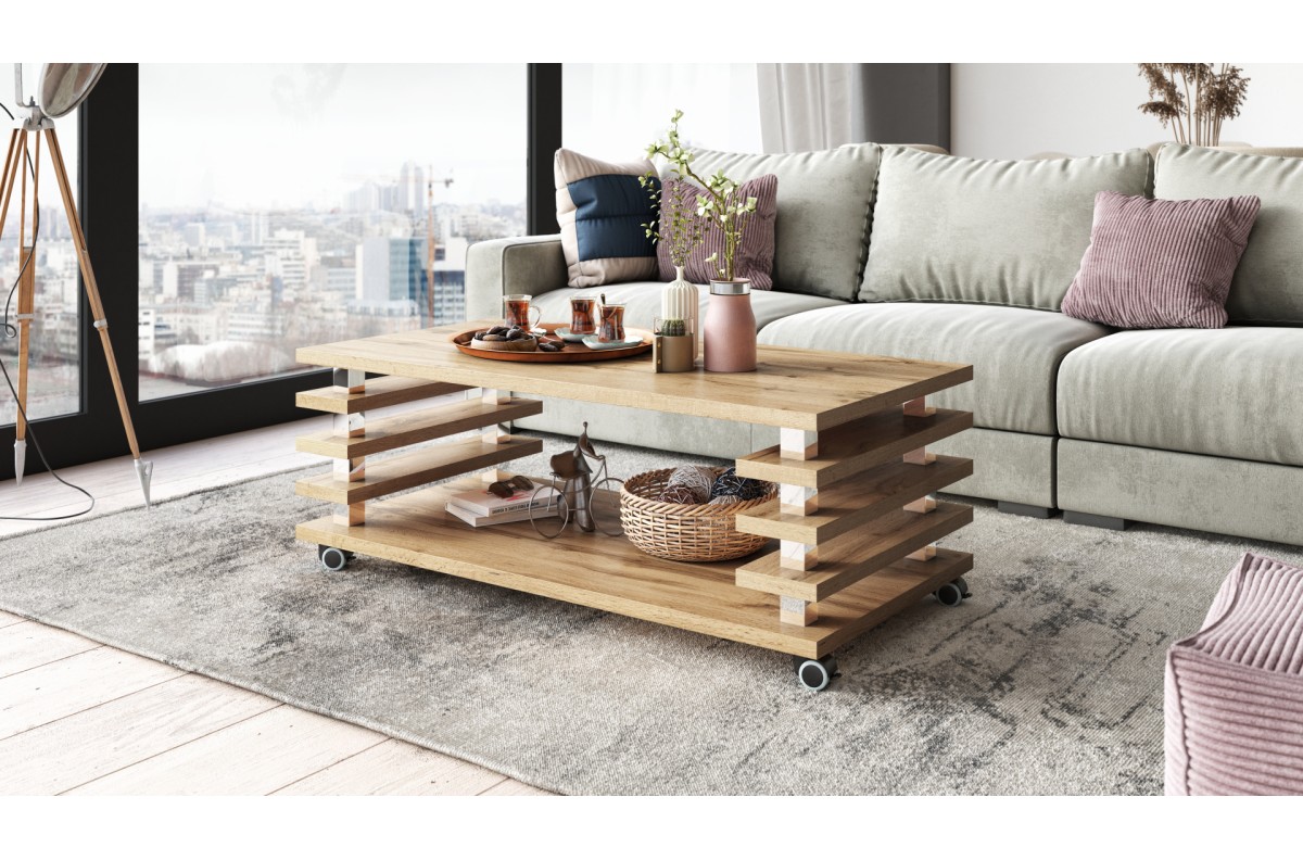 PORTO Wotan Oak – MODERNUS KAVOS STALIUKAS SU 2 IN 1 LENTELĖMIS ANT RATUKŲ/KOJELIŲ