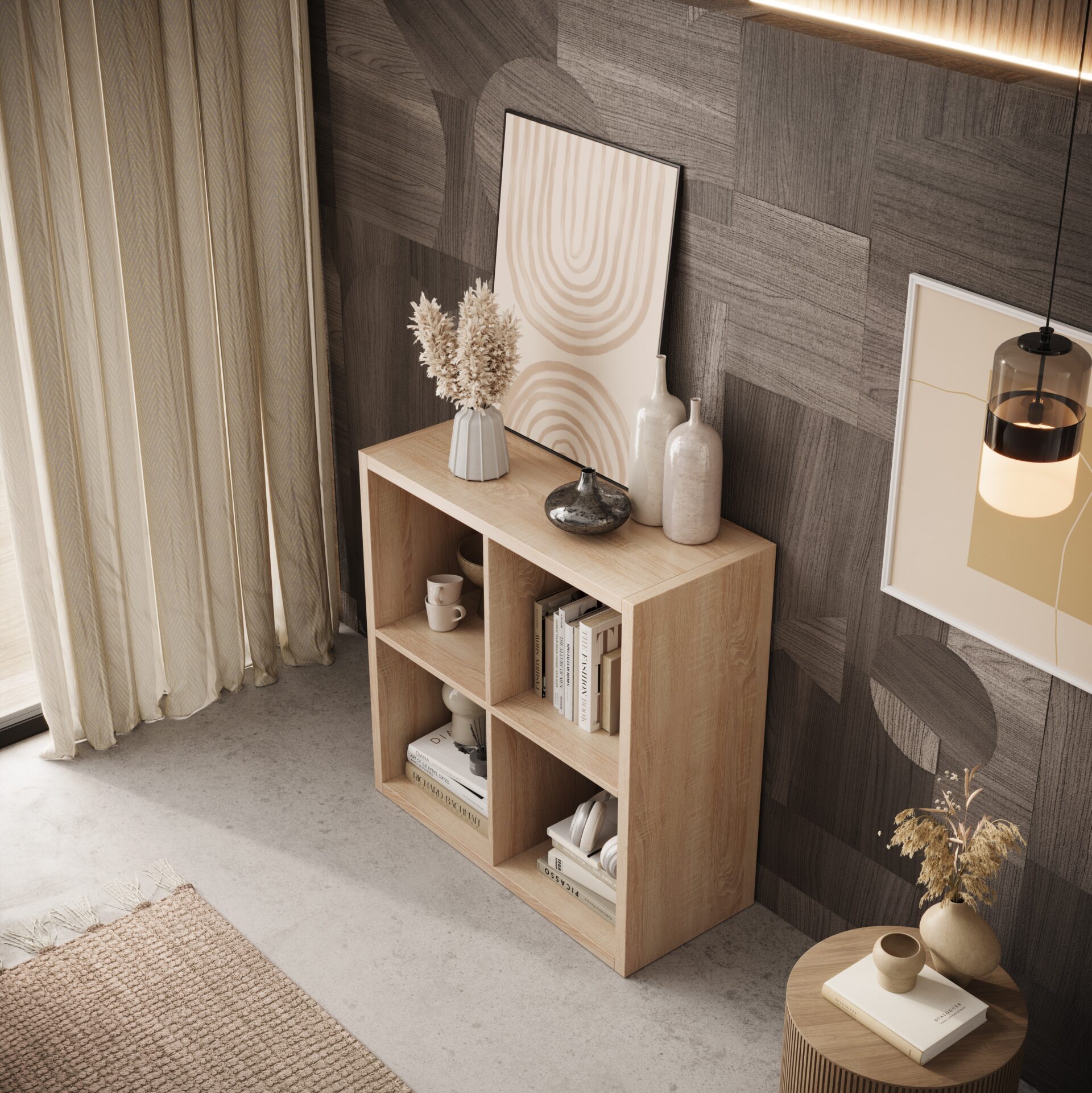 The Cleo III bookcase is a modern piece of furniture that combines style and functionality. Its elegant color scheme, combining classic white with the natural shade of Sonoma oak, makes it a perfect fit for any space – from living rooms and bedrooms to offices and children’s rooms. Its square design and four symmetrical shelves create a harmonious arrangement that is not only practical but also decorative. It’s ideal for storing books, documents, organizational boxes, or displaying decorations and plants. The bookcase’s compact dimensions make it suitable for both larger and smaller interiors without overwhelming the space. Made of durable materials, the Cleo III is distinguished by its durability and resistance to everyday use. Its simple form and universal style make it the perfect choice for those who value aesthetics and practicality. Choose order and design with the Cleo III bookcase!