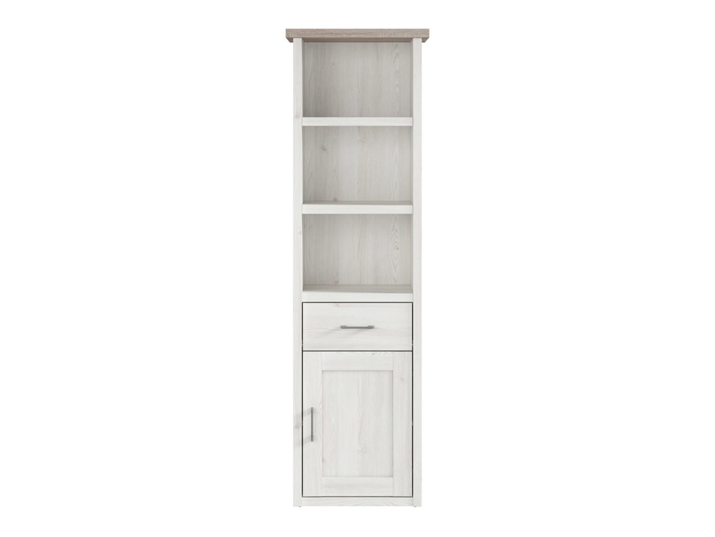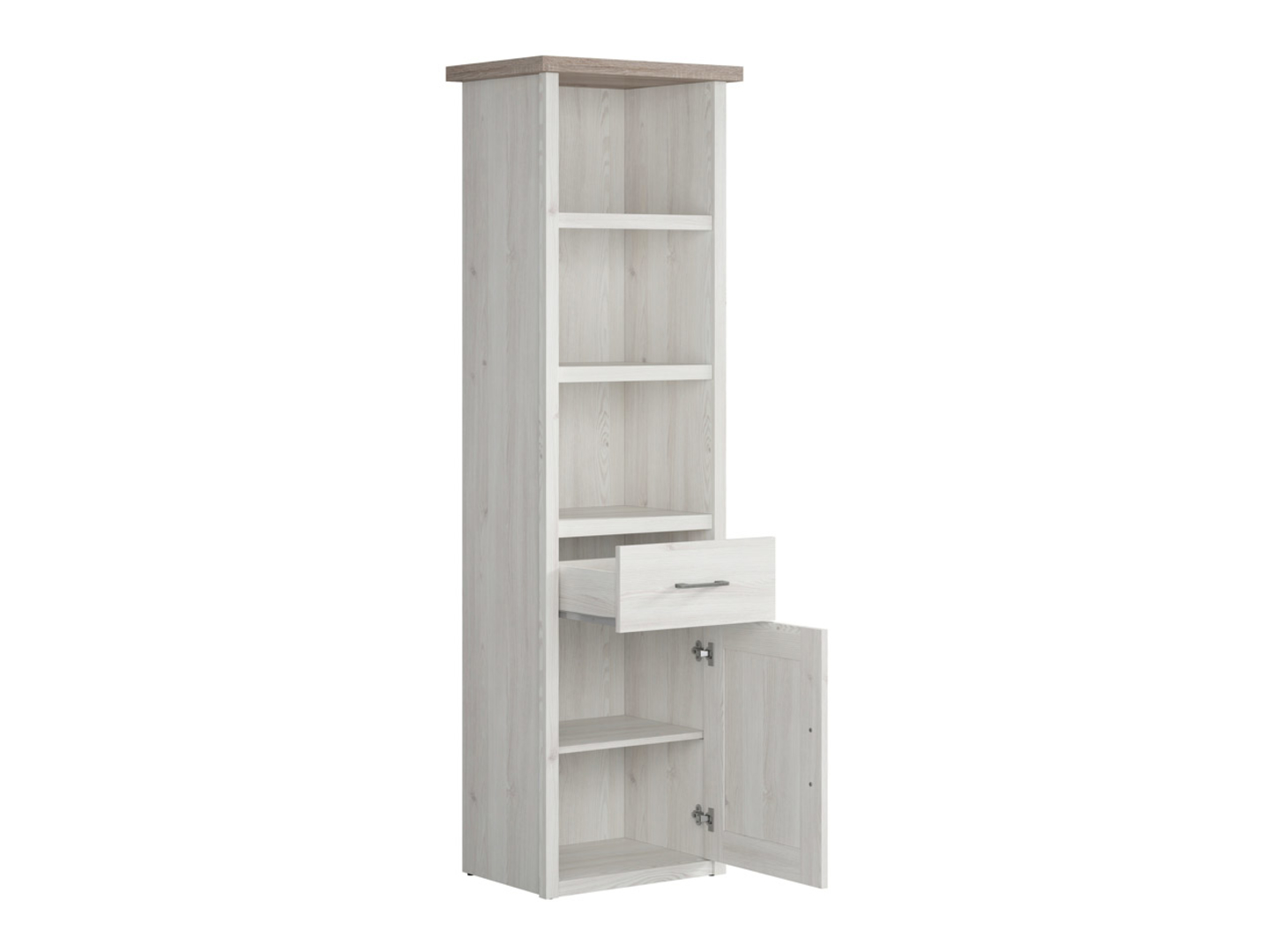 Luca Juzi Bookcase – Display and Store with Provencal Charm. As part of the Luca Juzi collection, a tribute to the Provencal style, the bookcase not only serves a practical storage function but also becomes a display area where each item acquires special significance. The Luca Juzi bookcase is the perfect solution for displaying and storing a variety of items. You can arrange books, decorative items, or souvenirs on the two shelves, creating a unique atmosphere. Additionally, a handy drawer and a spacious cabinet help maintain order by hiding rarely used items. The body and front of the bookcase are finished in light Sibiu larch, while the top edge is finished in dark Sonoma oak, giving the piece an elegant character. The distinctive slatted edges and the visible grain give the bookcase a unique charm, transporting the interior to the picturesque landscapes of Provence. The sturdy, antique-iron handles not only serve a practical purpose, making it easy to open drawers and cabinets, but also perfectly complement the collection’s character, adding an industrial touch. The tall bookcase perfectly complements a desk without taking up too much space, making it an ideal element for a variety of room arrangements. Create a fully functional space using the diverse elements of the Luca Juzi collection, such as a desk, wardrobe, bed, nightstand, shelving, and TV stand. Allow your living space to immerse itself in a bright, aesthetic interior where storage becomes an art form. The Luca Juzi bookcase—more than just a piece of furniture—is a showcase for your personal lifestyle.