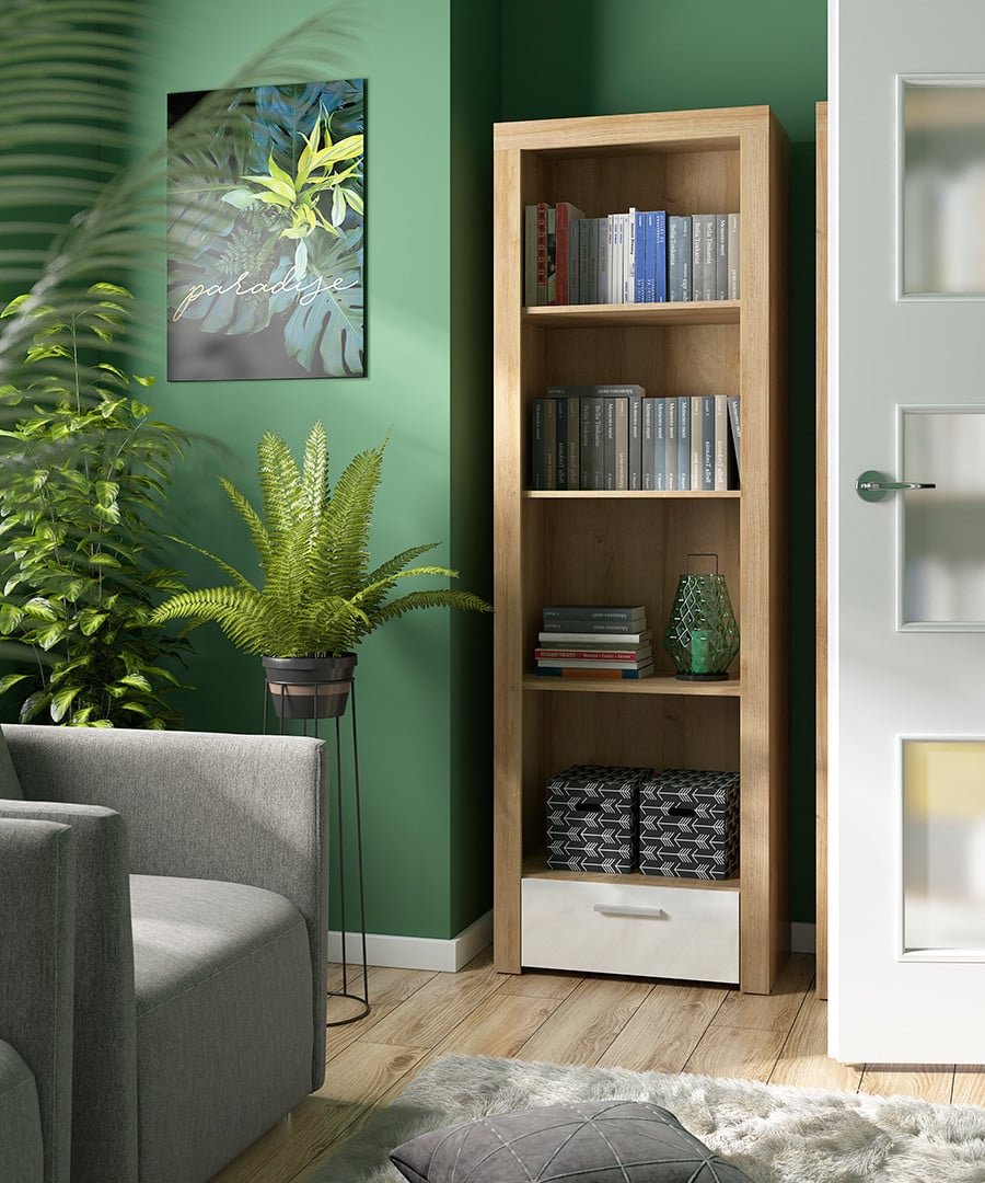 The Balder Bookcase is a modern and functional solution for those who appreciate simplicity in interior design. Its tall, open structure offers space not only for storage but also for displaying various items. With three practical shelves, the bookcase facilitates document organization, while a compact drawer at the bottom is the perfect place for small items. The geometric lines and design of the Balder bookcase are highlighted by the bold slats on the body. The combination of the warm shade of Riviera oak with a neutral white gloss creates a versatile base that blends perfectly with various décor styles. Branded accessories and simple handles ensure ease of use. You can freely combine the open Balder bookcase with other elements of the collection, creating a cohesive arrangement in a living room, bedroom, or youth room. This flexible approach allows you to freely furnish the space according to your preferences.