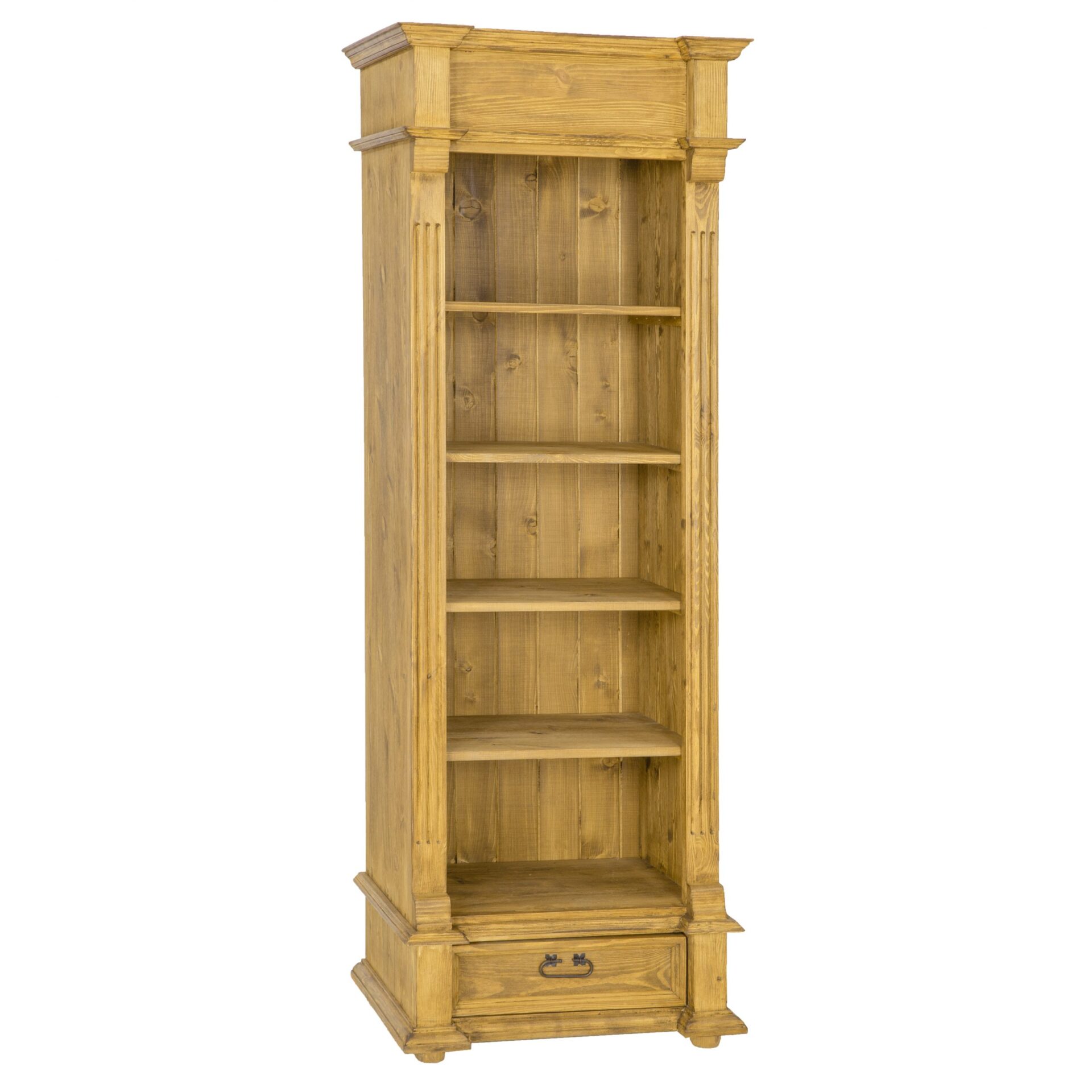 The waxed RG701 bookcase, designed in a rustic style, is crafted entirely from solid pine wood. It rests on wooden ball-shaped legs and features four open shelves (non-adjustable, mounted on slats) and one drawer that slides out on wooden rails. The entire unit is adorned with carved paneling and a uniquely raised top. This bookcase is perfect as a home library. It can also be used for storing household trinkets, ornaments, or keepsakes. It boasts a durable and sturdy construction. Handcrafted metal handles with an aged finish are used in its construction. The RG701 bookcase will add a unique atmosphere to any interior, full of warmth and a homely atmosphere. Its functionality makes storage much easier.