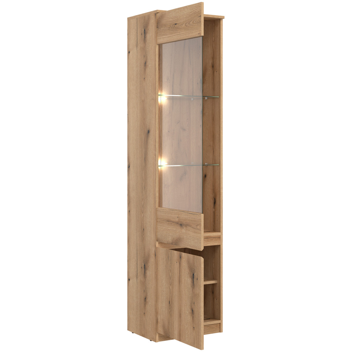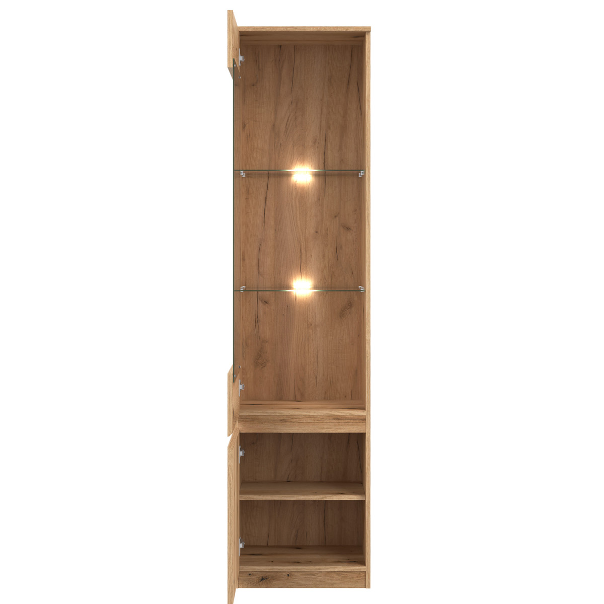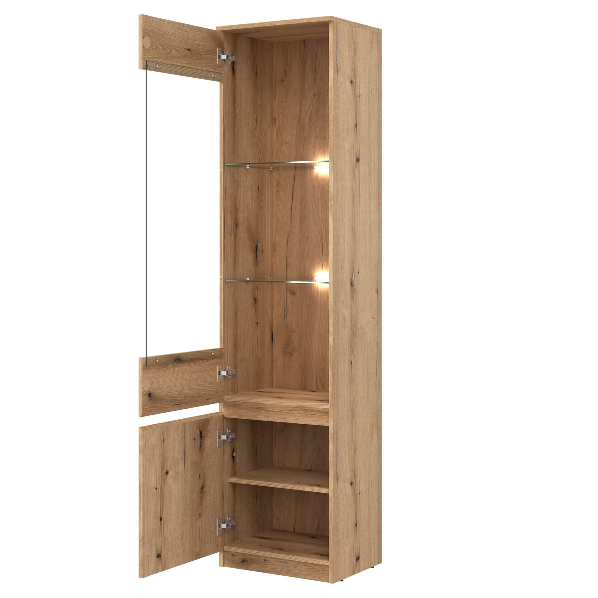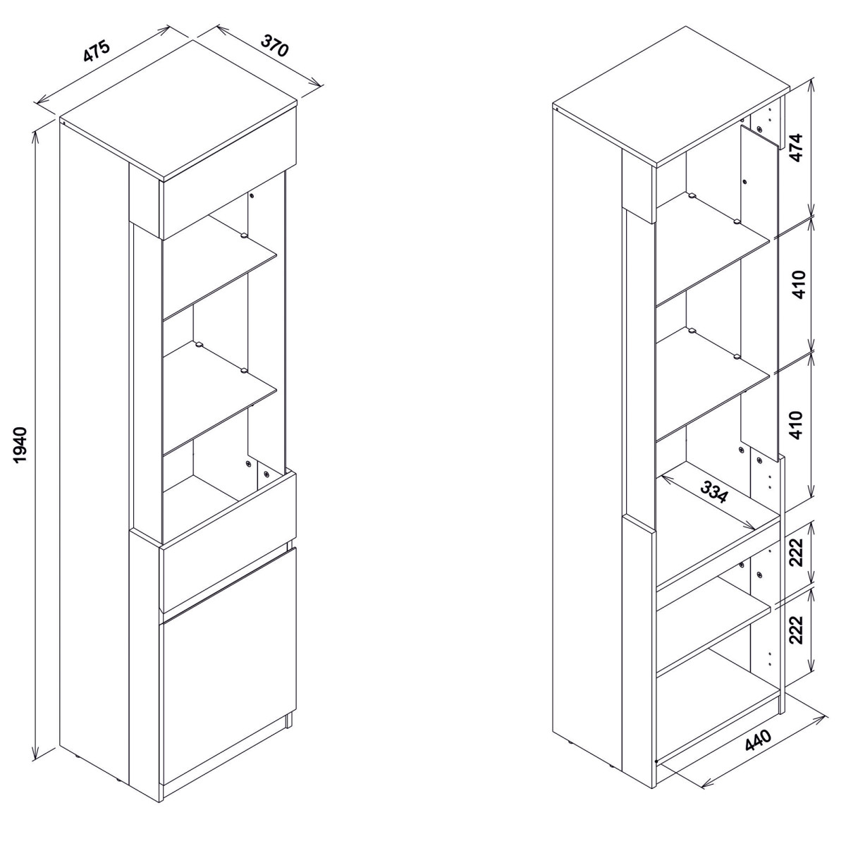 Width 47.5 cm Depth 37 cm Height 194 cm Product weight with packaging 51.95 kg Manufacturer’s code / symbol RM07 Collection name REMI Number of product packages 2 Style Modern Equipment Assembly instructions / assembly accessories Assembly For self-assembly Tabletop material / type / thickness laminated chipboard 16 mm Body material / type / thickness laminated chipboard 16 mm Shelf material / type / thickness laminated chipboard 16 mm Shelf quantity 1 Front material / type / thickness laminated chipboard 16 mm Front handle / design / color milled Glazed front glass design / color Tempered / colorless Glass shelf quantity 2 Interior lighting light color Warm white Leg / design / color plinth