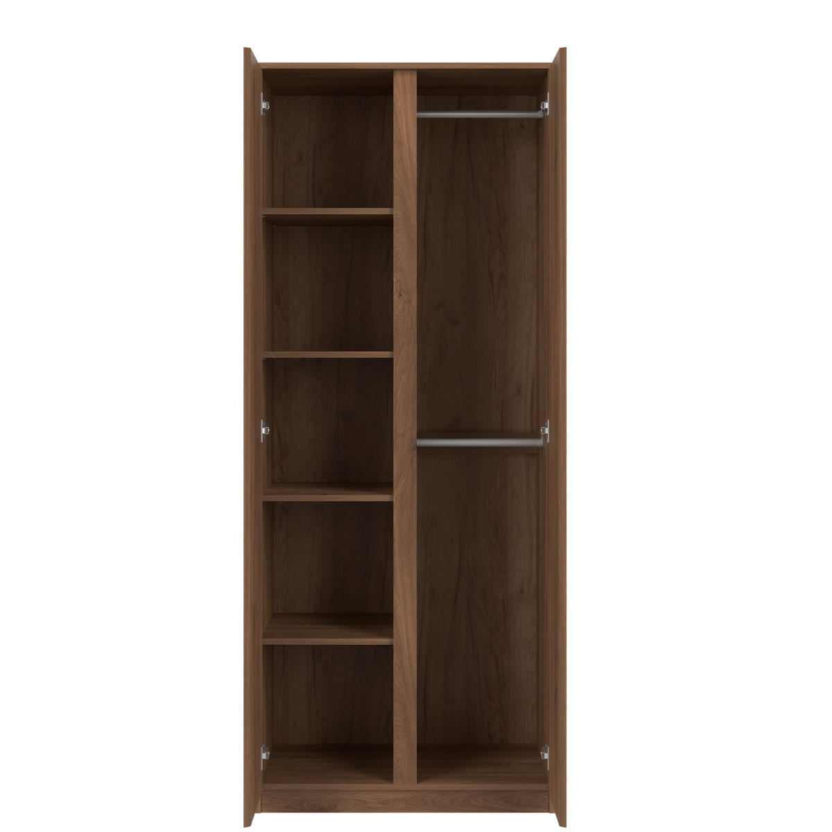 The REMI RM10 wardrobe is perfect for a bedroom, office, or study. The interior is divided into two sections. On the left side are shelves for clothes, and on the right are two rails for hanging clothes, providing a convenient solution to all storage problems. Its distinctive and attractive design makes it a perfect addition to any space. Its modern color scheme allows you to create the perfect interior, tailored to the taste and requirements of its users. Striking millings on the fronts, replacing traditional handles, emphasize the overall design. The collection is characterized by a minimalist look and functionality. The wardrobe is ideally suited to combinations with other pieces from the REMI series or as a standalone piece, adapting to your room’s interior design.