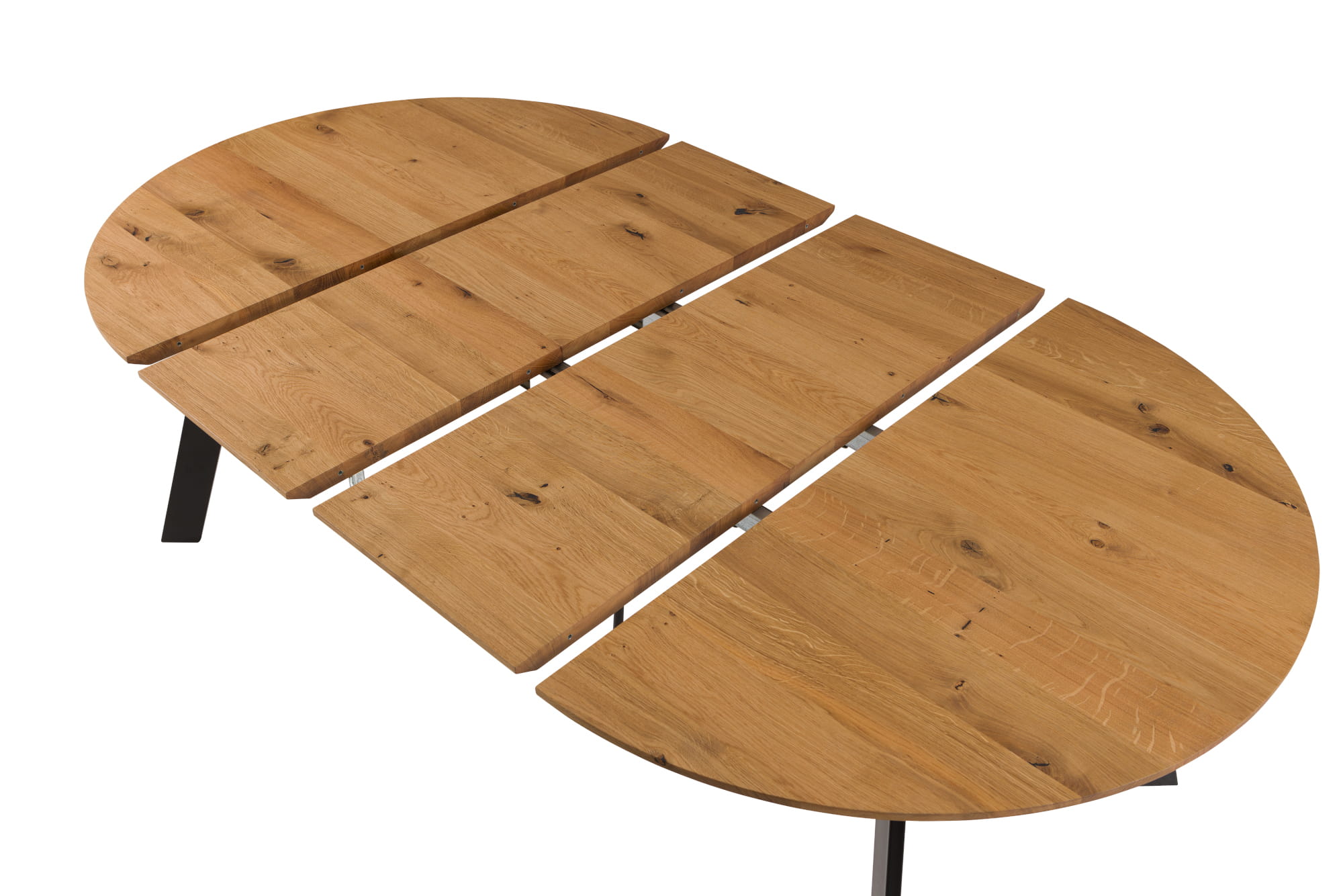 The Romano table is an elegant, round table made of solid ash, combining the natural beauty of the wood with a modern touch of metal legs. It extends thanks to two additional leaf plates, allowing you to easily expand the table surface.