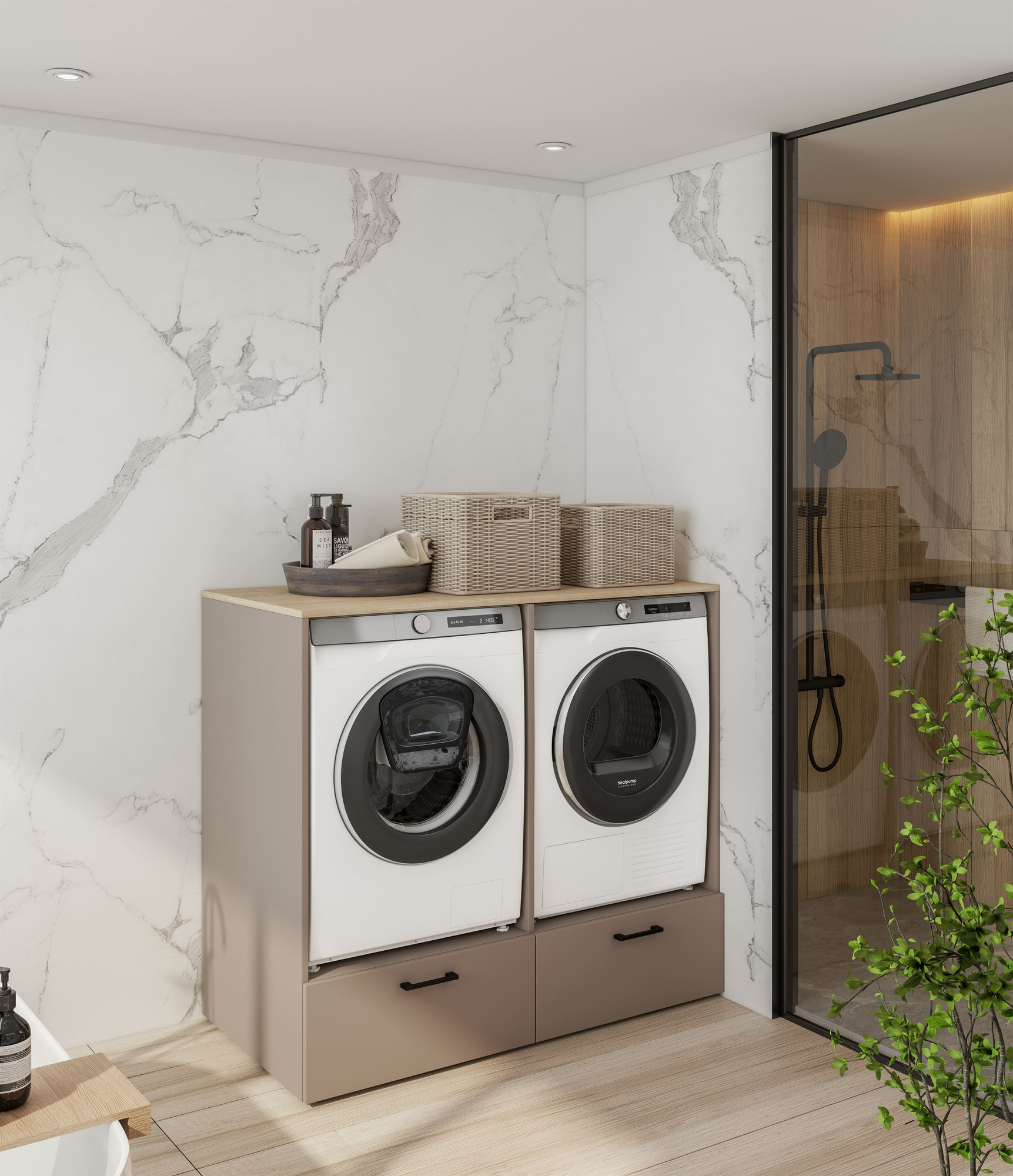 Discover the beauty of functionality with the Rosa built-in washing machine and dryer. This eye-catching unit in Congo Oiled Oak is a perfect blend of aesthetics and practicality. Thanks to its versatile color scheme, it will complement a variety of interior designs while maintaining a modern look. This unit not only provides storage for appliances but also a stylish addition to your bathroom or utility room. Rosa stands out with its well-thought-out proportions, offering the perfect dimensions for any interior, and its 132 cm width and 117 cm height ensure you’ll find a place for it in any room. The materials used, such as laminated board, ensure durability and ease of maintenance. Additionally, metal handles and adjustable legs guarantee stability and comfort. This built-in unit is a solution that will certainly simplify everyday life. A key advantage of the Rosa built-in unit is its functionality. It features a spacious layout that not only accommodates a washing machine and dryer but also offers shelves for storing detergents and laundry accessories. This way, you have everything at your fingertips, making laundry much more enjoyable. Organized space combined with an elegant design is the key to a harmonious interior.