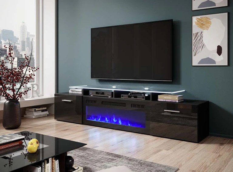 The ROVA EF TV stand stands out from other models thanks to its glass top, which incorporates lighting, adding character. Combined with the electric fireplace, you’ll enjoy sitting comfortably in an armchair and feeling relaxed. The fireplace will warm your home on cold days and cool it down on hot days. It’s a great solution for making your home feel cozy yet elegant. Material: