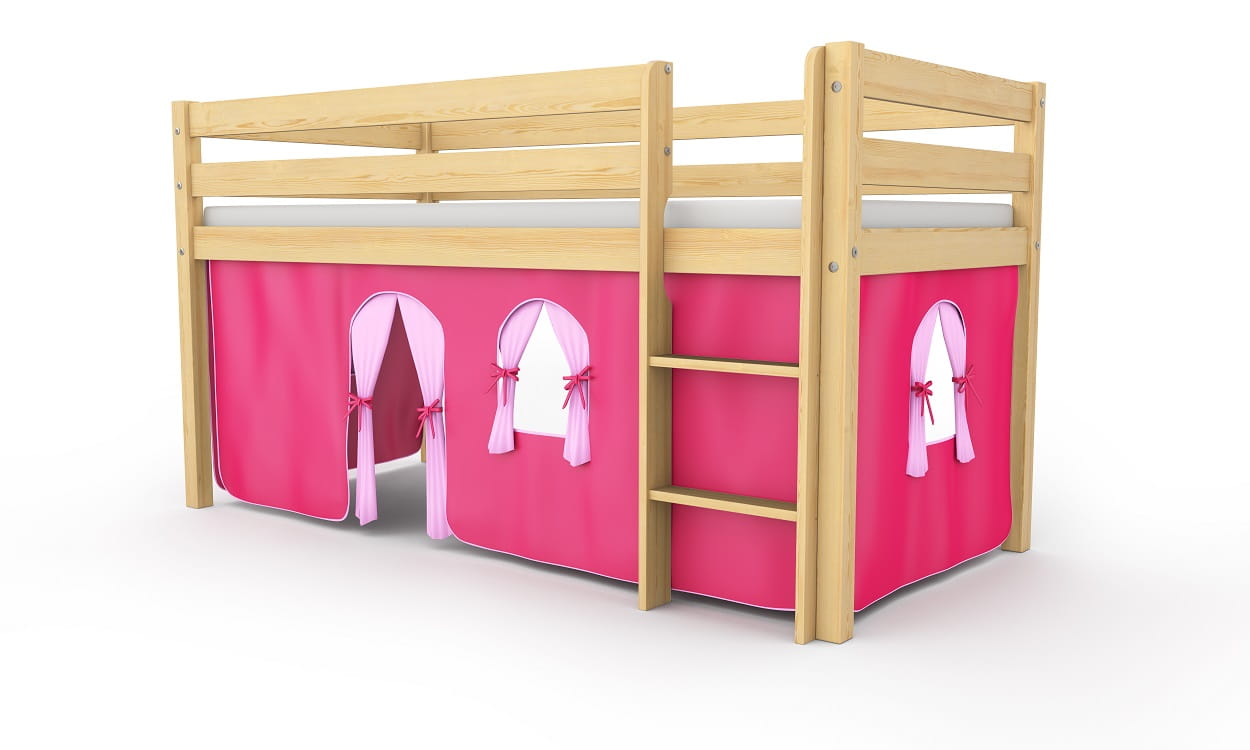 A bunk bed isn’t just a great place to relax. It can also serve as a base for many children’s games. Various accessories can be added to each floor to make this possible. The lower floor can be equipped with a curtain. Through this door, the child can enter or exit their hiding place. The curtain also has windows, located in several places. The entire design is decorated in pink colors, which every little princess will appreciate. The curtain is made of cotton. It can also be combined with other elements, such as a tunnel to the upper floor or a tower. Curtain for bunk beds. 100% cotton. Curtain in pink. Size: 1. Front length: 200cm, height: 75cm, 2. Sides length: 98cm, height: 75cm.