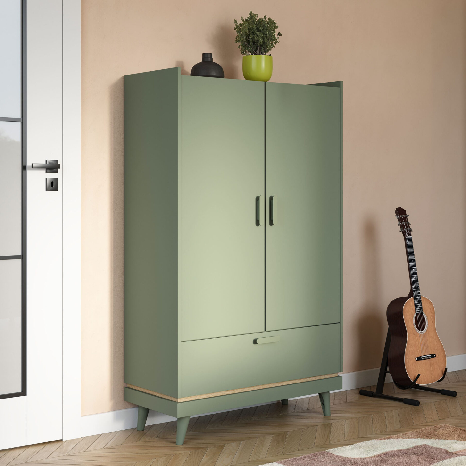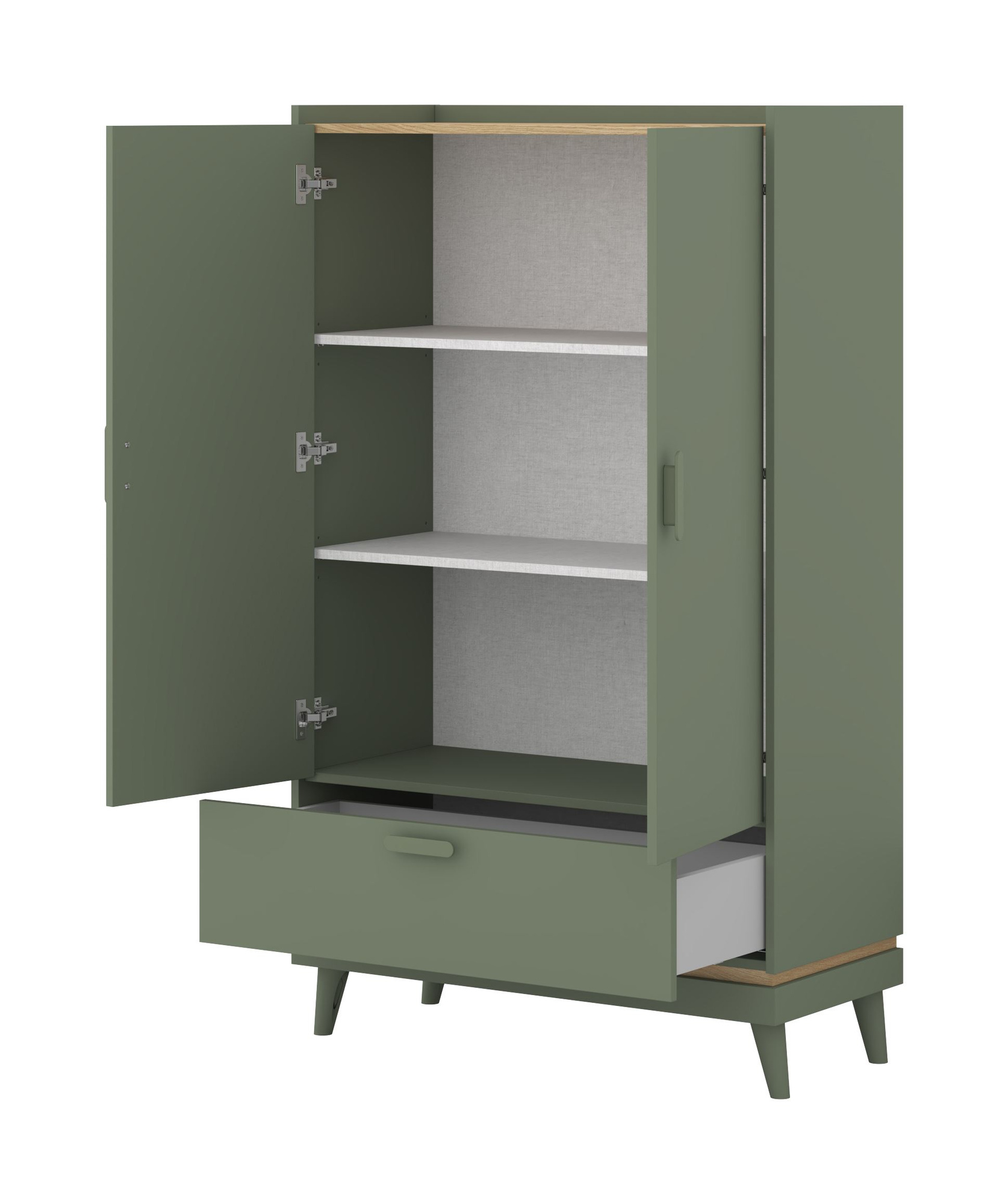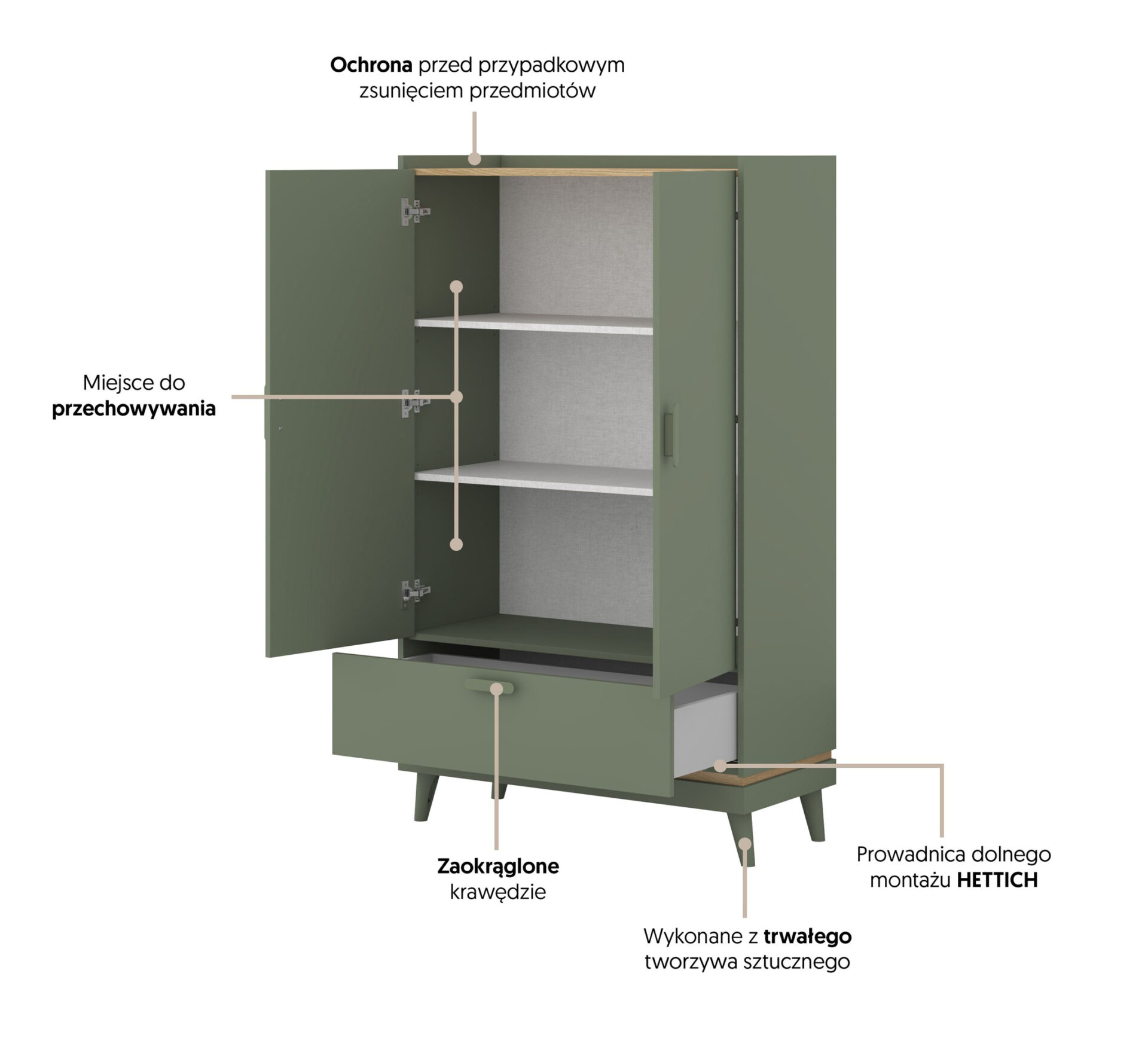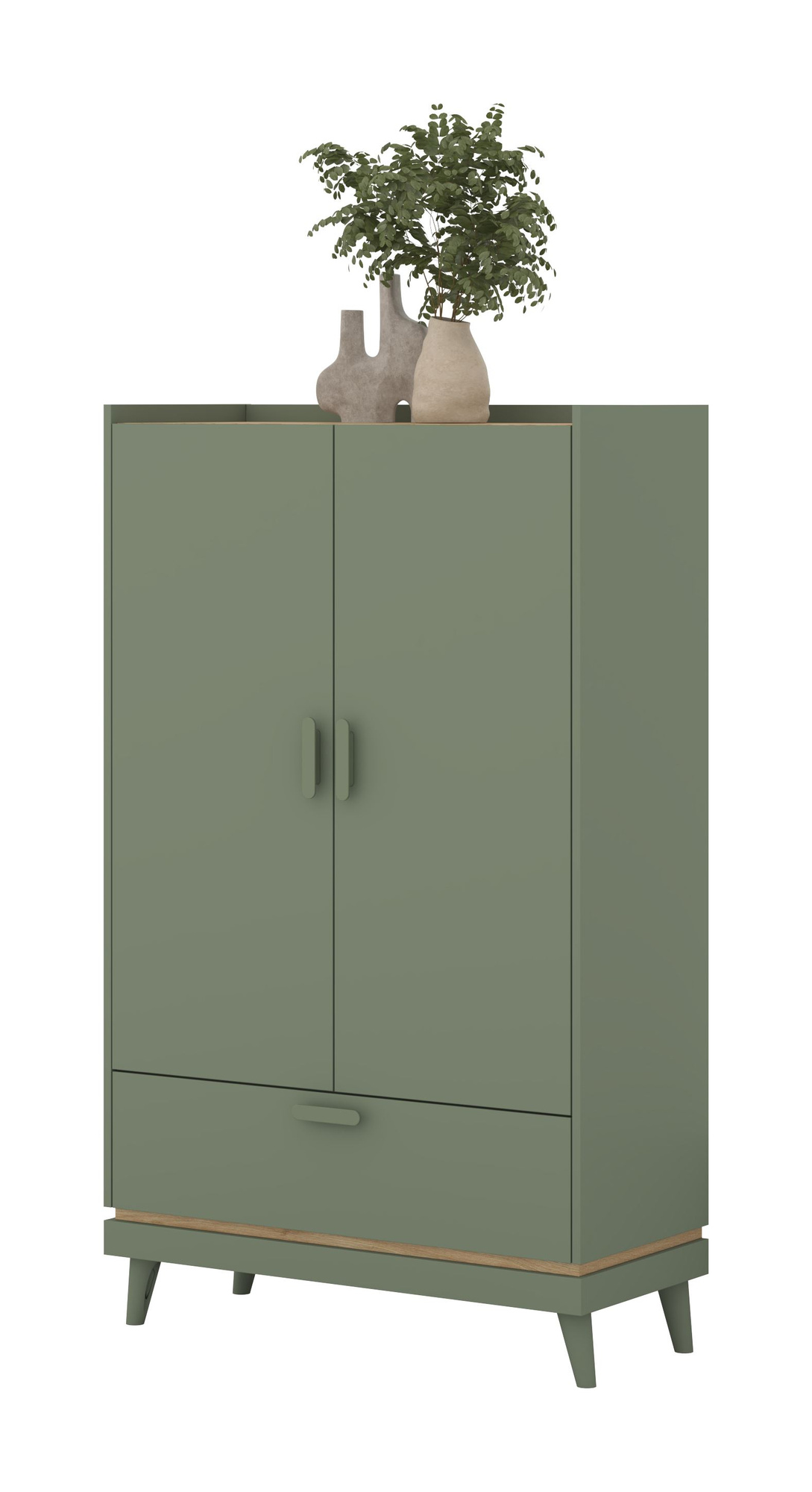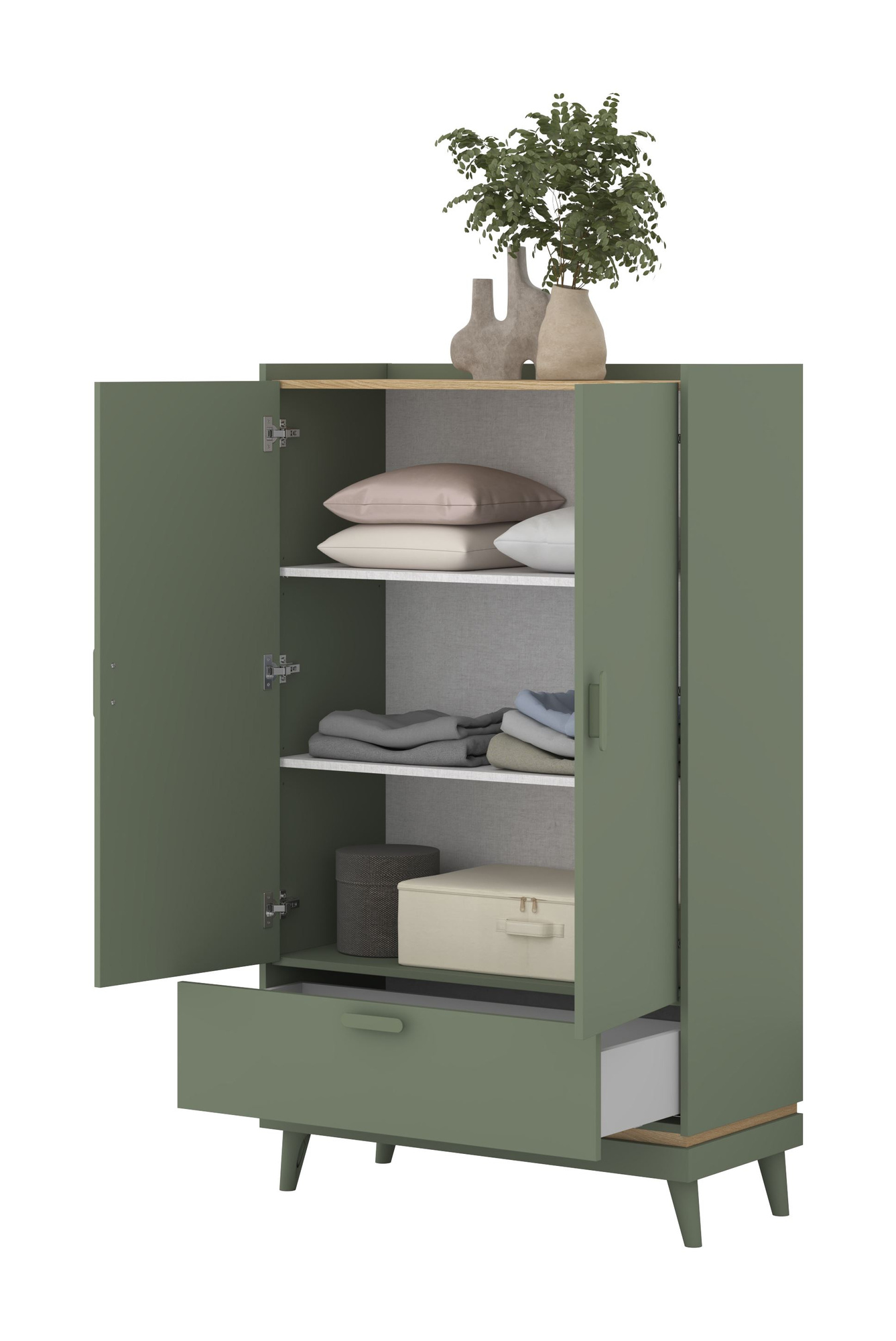 Discover the unique charm of the Scandi linen closet in muted green with an oak finish, which will perfectly enhance any interior. Designed with harmony and style in mind, this elegant linen closet will be the focal point of your bedroom, adding a refined character. Its classic aesthetic and subdued colors make it a perfect fit for a variety of interiors – from modern to Scandinavian. The Scandi linen closet offers not only aesthetic appeal but also practical solutions. Thanks to spacious shelves and a roomy drawer, you can easily organize your linen and accessories. The practical design, combined with easy access to the interior, will make organizing your belongings a pleasure every day. The muted green of the furniture will bring a touch of peace and relaxation to your home, ideal for everyday tasks. Made of high-quality materials, the linen closet is characterized by long-lasting durability. The laminated board of the body and front ensures resistance to damage and ease of maintenance. Thanks to the use of innovative hinges and guides, the furniture operates quietly and smoothly, contributing to comfortable use. Furthermore, the self-assembly option makes the chiffonier easy to transport and assemble in a convenient location.