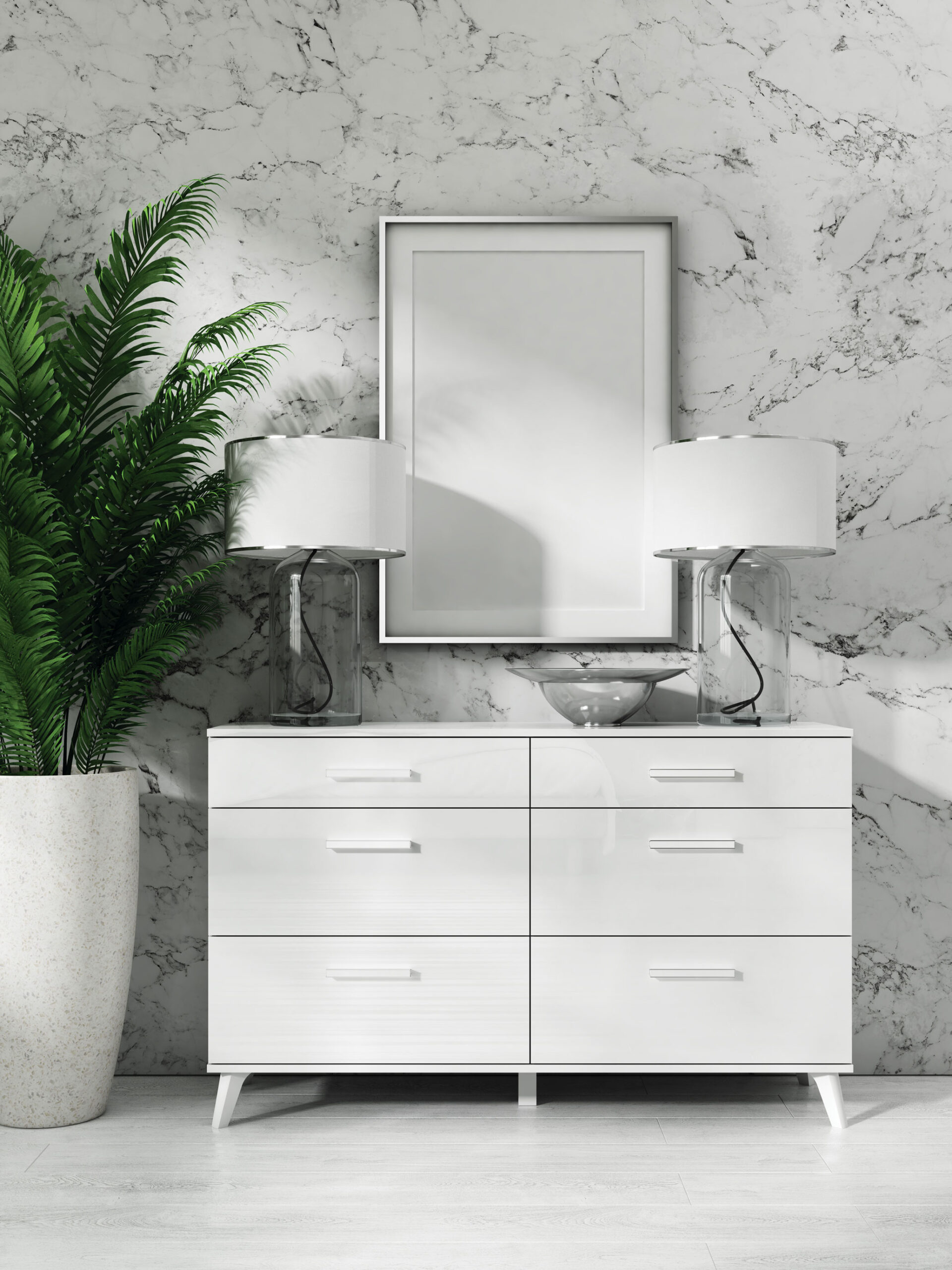 The Secco display cabinet is the perfect piece for your living room. Its neutral white color allows it to complement a wide variety of interiors. The design combines display functions with ample storage space. The cabinet features five lockable compartments, perfect for storing cutlery sets, tablecloths, or other home textiles. The left side of the cabinet, behind the glass doors, features two optionally illuminated glass shelves, dividing the space into three compartments. These compartments are perfect for displaying glasses, favorite vases, or travel souvenirs.