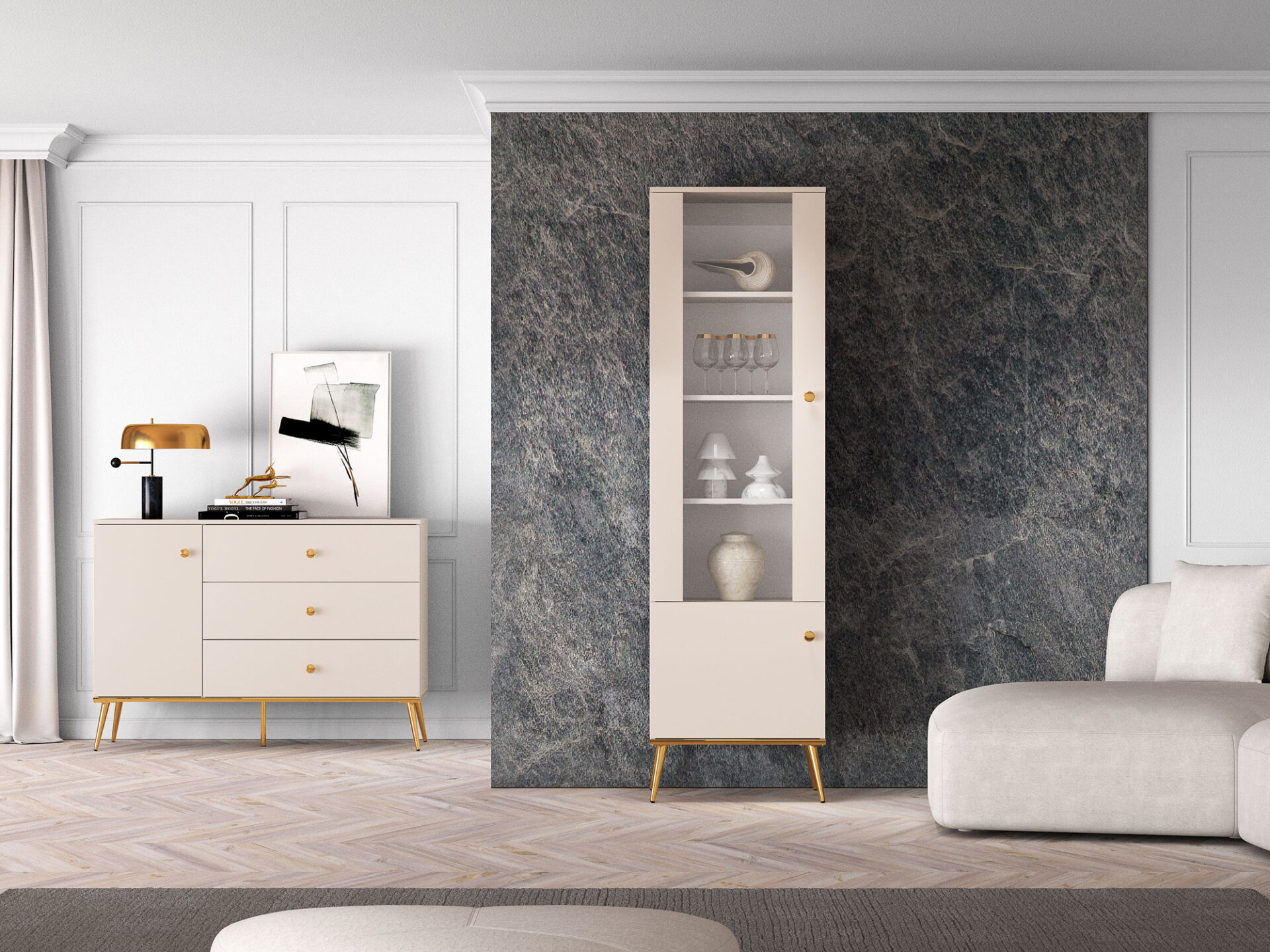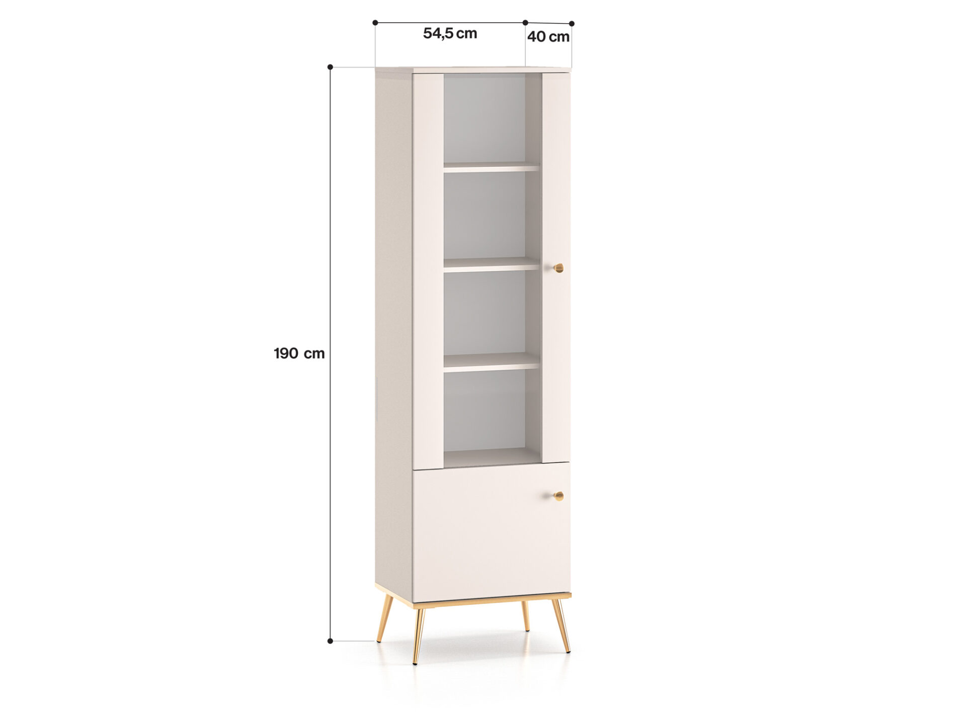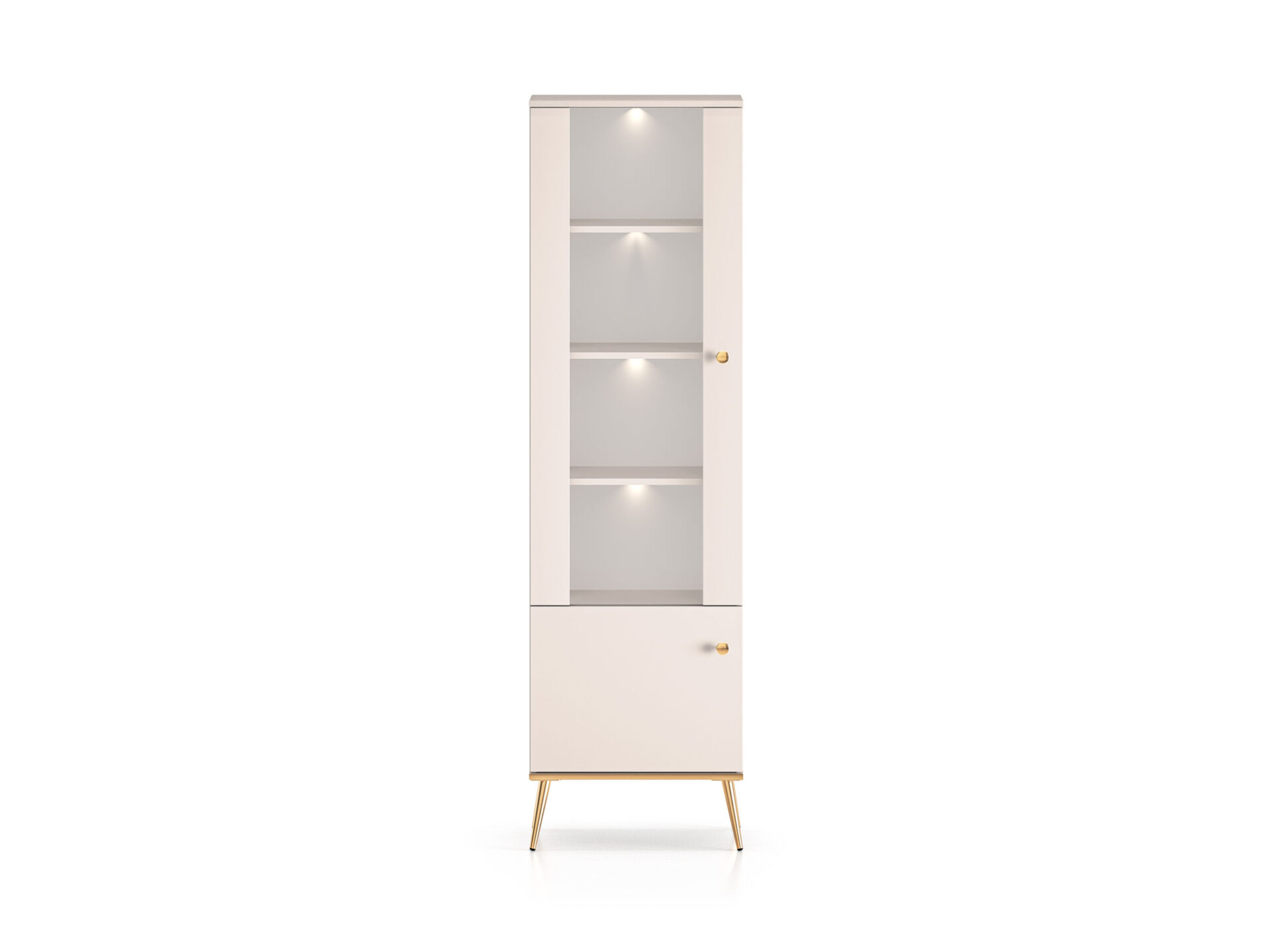 The Selgin 01 display cabinet is a piece of furniture that lets you showcase your favorite items. Three shelves divide the glass-enclosed space into four niches. These are perfect for storing glasses, a porcelain collection, or souvenirs from your travels. The lower section features a lockable shelf for storing tableware or tablecloths. The cabinet rests on stable, high legs made of durable metal. Double-galvanized handles and gold-colored legs guarantee years of comfortable use. Furniture from the Selgin collection combines high functionality with a stunning design.