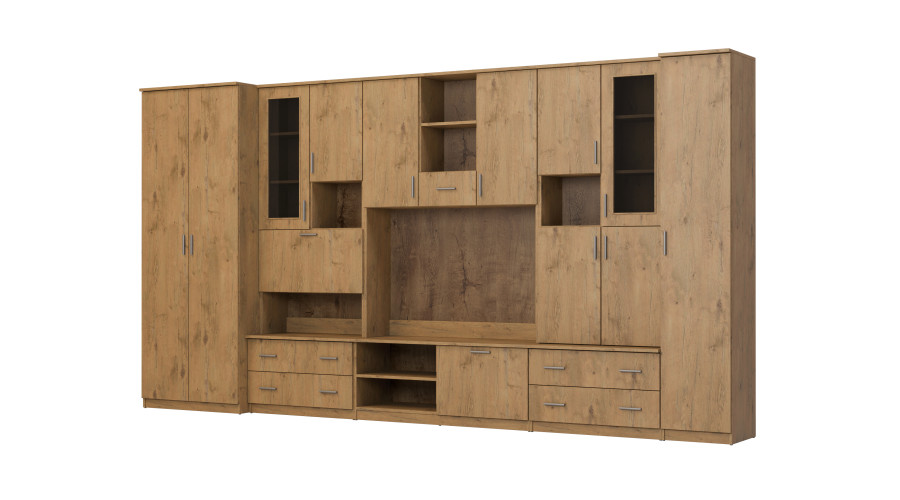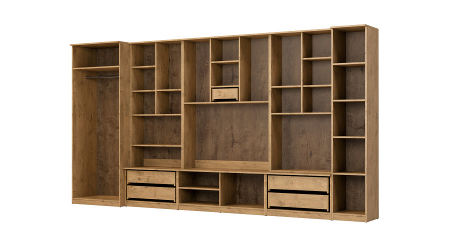 The wall unit includes a spacious wardrobe, numerous lockable cabinets, open shelves, and a bar, which is a practical addition to the entire system. The central section with space for a TV allows for convenient display of electronics, while the logical arrangement of the modules facilitates the aesthetic organization of accessories and multimedia elements.