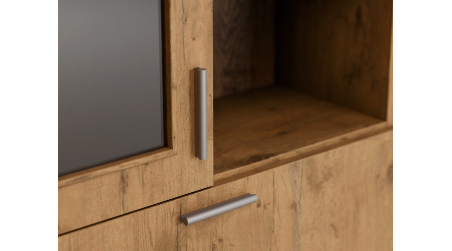 The Light Sonoma color gives the unit a neutral and light character, brightening the space and facilitating its integration into various interior designs. The light wood finish creates a cohesive look and doesn’t visually dominate the room. Like all wall units available at e-Meblast, the CYKLON model can be customized in terms of dimensions, colors, element layout, and hardware, allowing you to create a set tailored to your individual needs and room size.