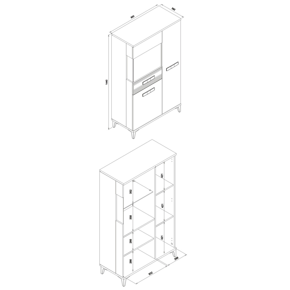 Width 85 cm Depth 39.5 cm Height 145 cm Product weight with packaging 52.25 kg Manufacturer’s code / symbol SB06 Collection name SNOBI Number of product packages 3 Style Modern Equipment Assembly instructions / assembly accessories Assembly For self-assembly Body color golden craft oak Top material / type / thickness laminated chipboard 22 mm Body material / type / thickness laminated chipboard 16 mm Shelf color golden craft oak Shelf material / type / thickness laminated chipboard 16 mm Shelf quantity 3 Back wall visible part color golden craft oak Front color golden craft oak / glossy alpine white Front material / type / thickness chipboard 16 mm / MDF 18 mm Front handle / material / color metal Glazed front material / color tempered glass antisol brown Glazed front glass thickness 4 mm Glass shelf glass color: colorless float Glass shelf: glass thickness: 6 mm Glass shelf quantity: 1 Internal lighting: light color: warm white Soft-close door system: standard Leg / finish / color: PLASTIC NON-ADJUSTABLE