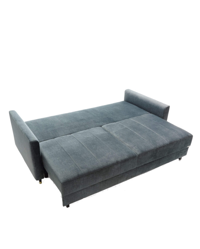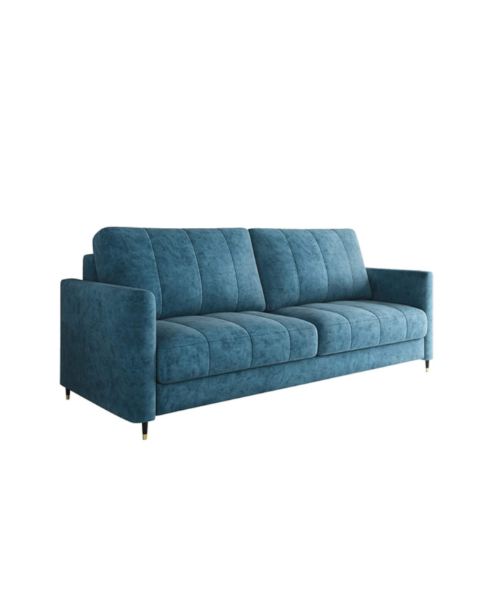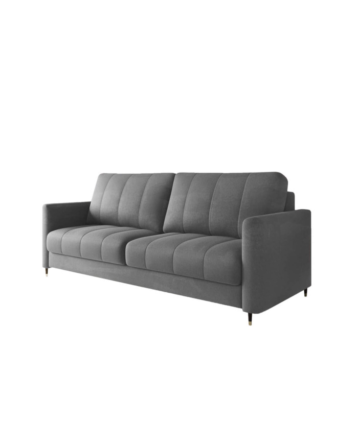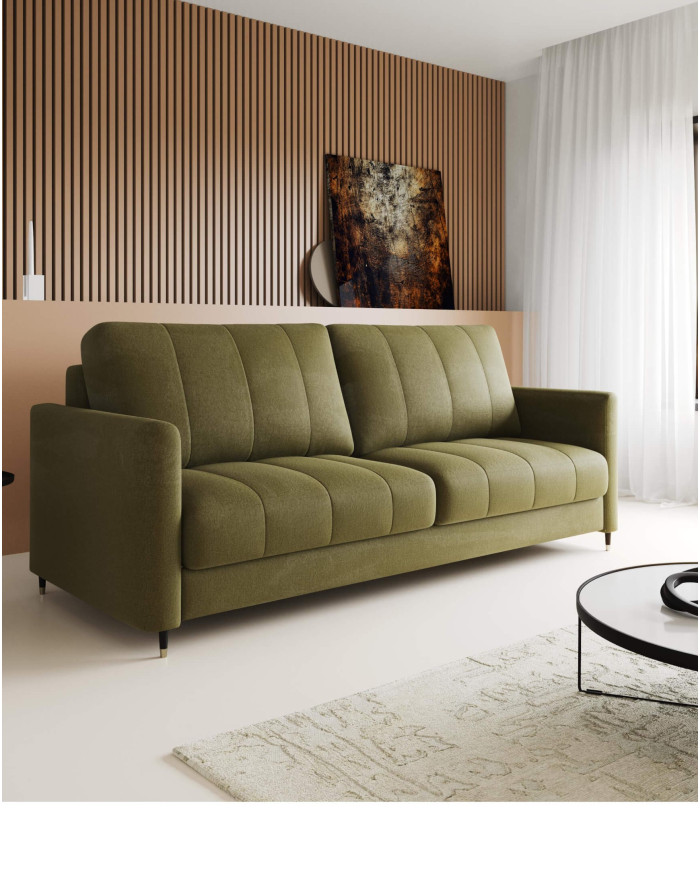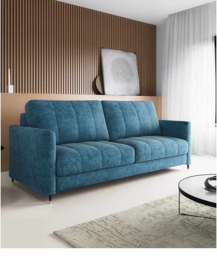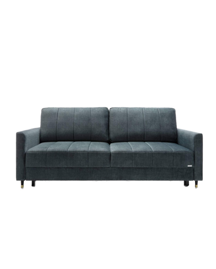 The Hugo reclining sofa was designed with contemporary interiors in mind. It features fashionable, vertically stitched cushions that contrast with the sleek armrests. The sofa rests on black wooden legs with brass accents. The sofa features a DL sleeper function. The process of transforming the comfortable sofa into a spacious place for nighttime and daytime relaxation is aided by special automatic unfolding mechanisms, requiring minimal force. The sofa is equipped with a comfortable Lux foam and spring system, ensuring high comfort. It consists of sinuous springs, Bonnell springs, and highly elastic HR foams located in the seat. The sofa is available in a wide range of upholstery materials and requires minimal assembly. A fabric sample is available in the product creator.
