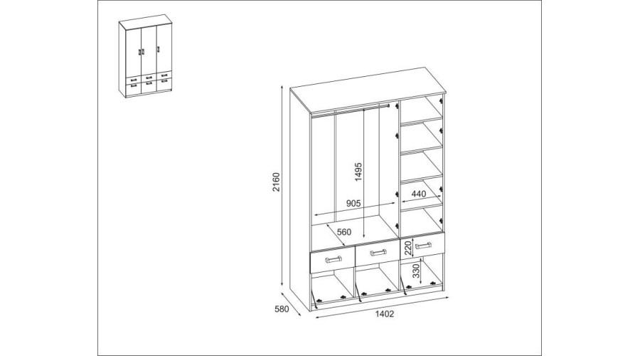 The interior of the wardrobe is designed to provide ample storage space. You’ll find a clothes rail for hanging clothes, as well as a range of shelves of appropriate height and depth. Additionally, three drawers are perfect for hiding smaller items.