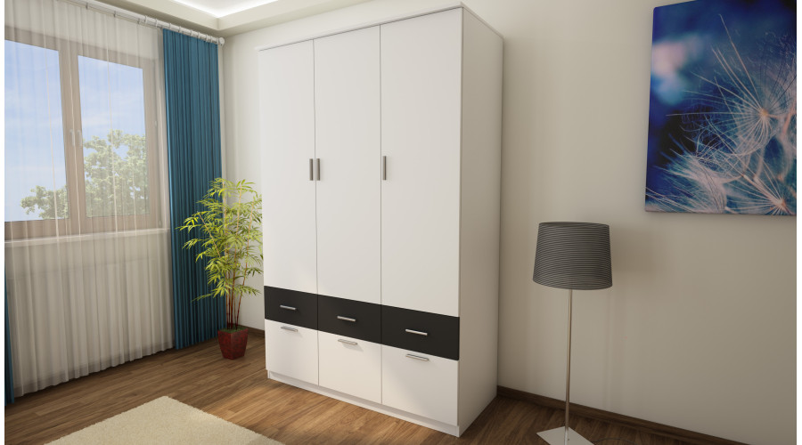 This wardrobe with swing doors is a model that perfectly complements modern interior design and is an integral part of our wardrobe. Its fashionable white fronts keep up with the latest trends. This wardrobe offers a spacious interior enriched with practical features.