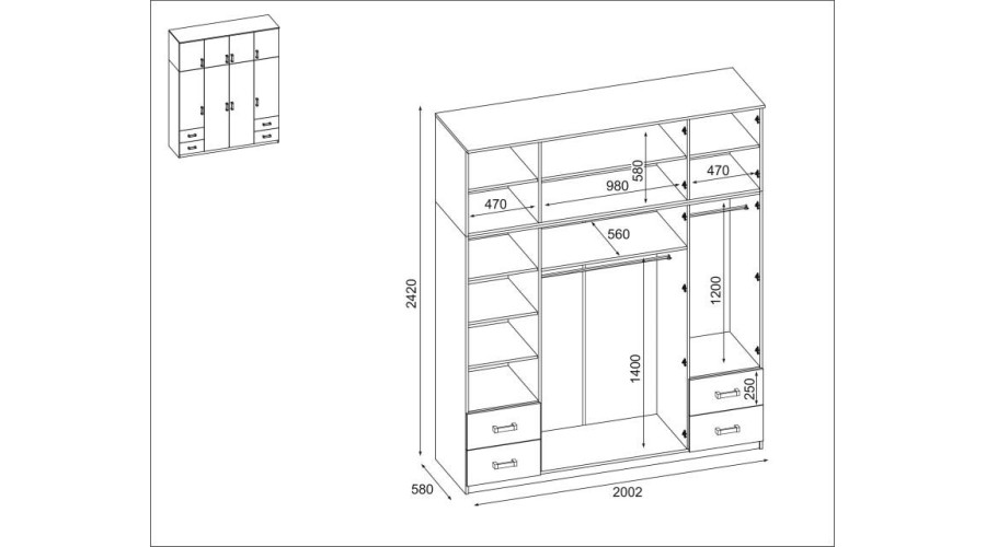Spinta 200/242 – drabužių kabykla, vidinės lentynos, išoriniai stalčiai
