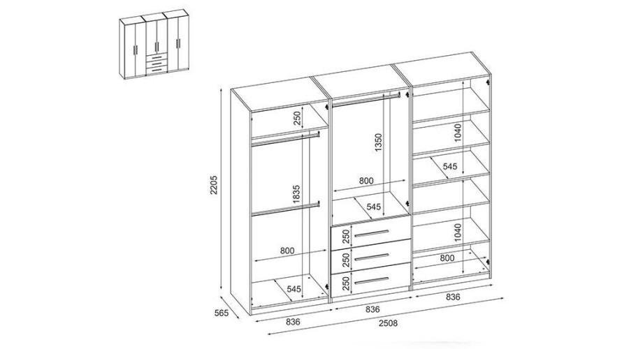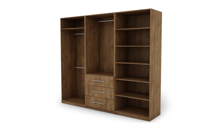 Spinta 250/220 – drabužių kabyklos, vidinės lentynos, išoriniai stalčiai