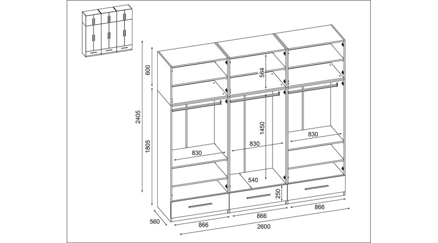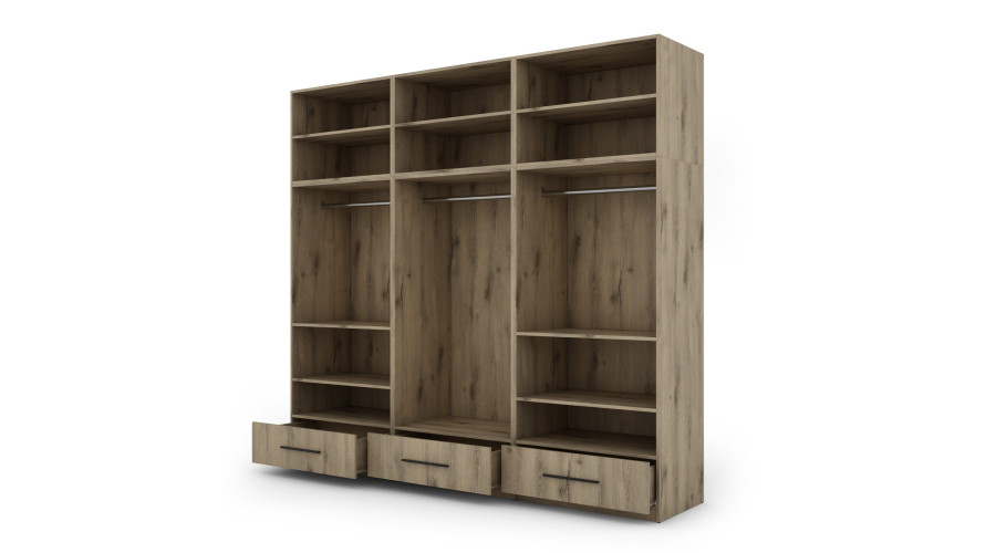 Spinta 260/240 – drabužių kabyklos, vidinės lentynos, išoriniai stalčiai