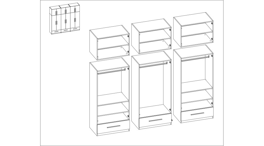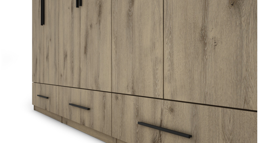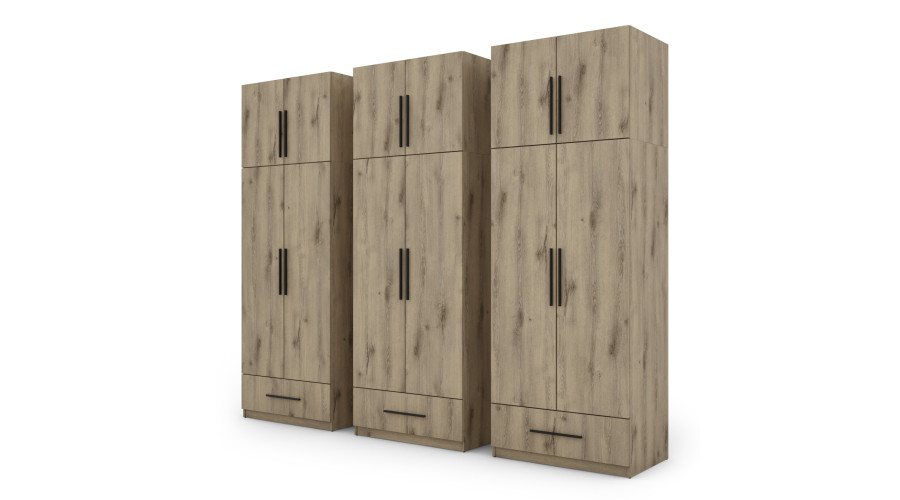 The shelves, rails, and drawers enhance its functionality. The set consists of 6 separate segments (3 base units and 3 upper units), which together create a spacious wardrobe. Each segment has a different functionality and purpose, and by combining them, you’ll create an incredibly spacious set with room for all your belongings. If desired, the wardrobes can also be placed separately, which is a definite advantage.