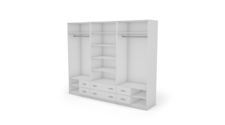 Spinta 270/220 – drabužių kabykla, vidinės lentynos, 6 erdvūs stalčiai