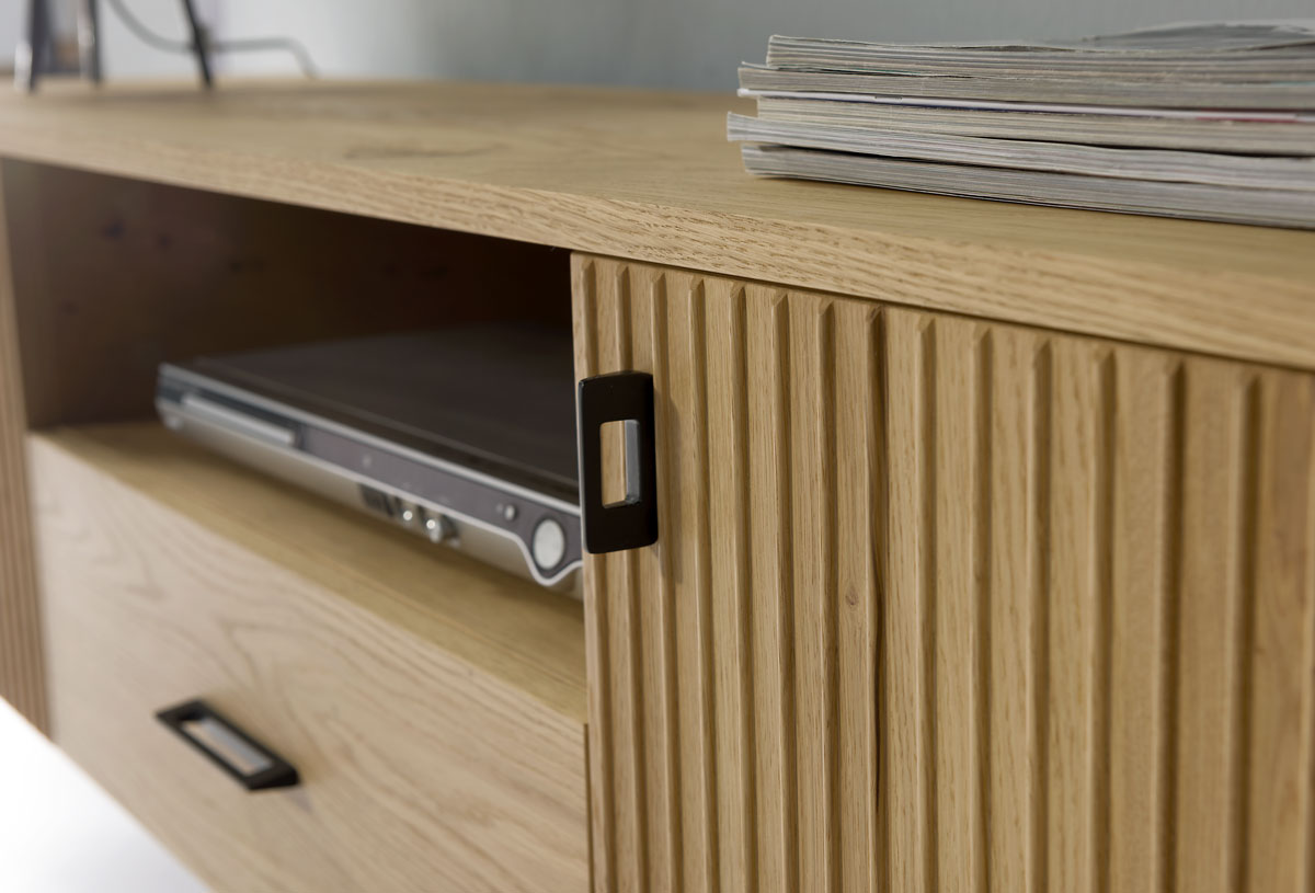 TV stand NAVARRA NA-RTV/DInclusive collection with 3D facade and natural oak wood texture creates a warm, contemporary character. An expression of contemporary modernity, fragrant with nostalgia of the past. The showcases also use a natural oak back and subtle shelf lighting that highlights the charm of the oak structure.Top: MDF laminated with oak veneer.