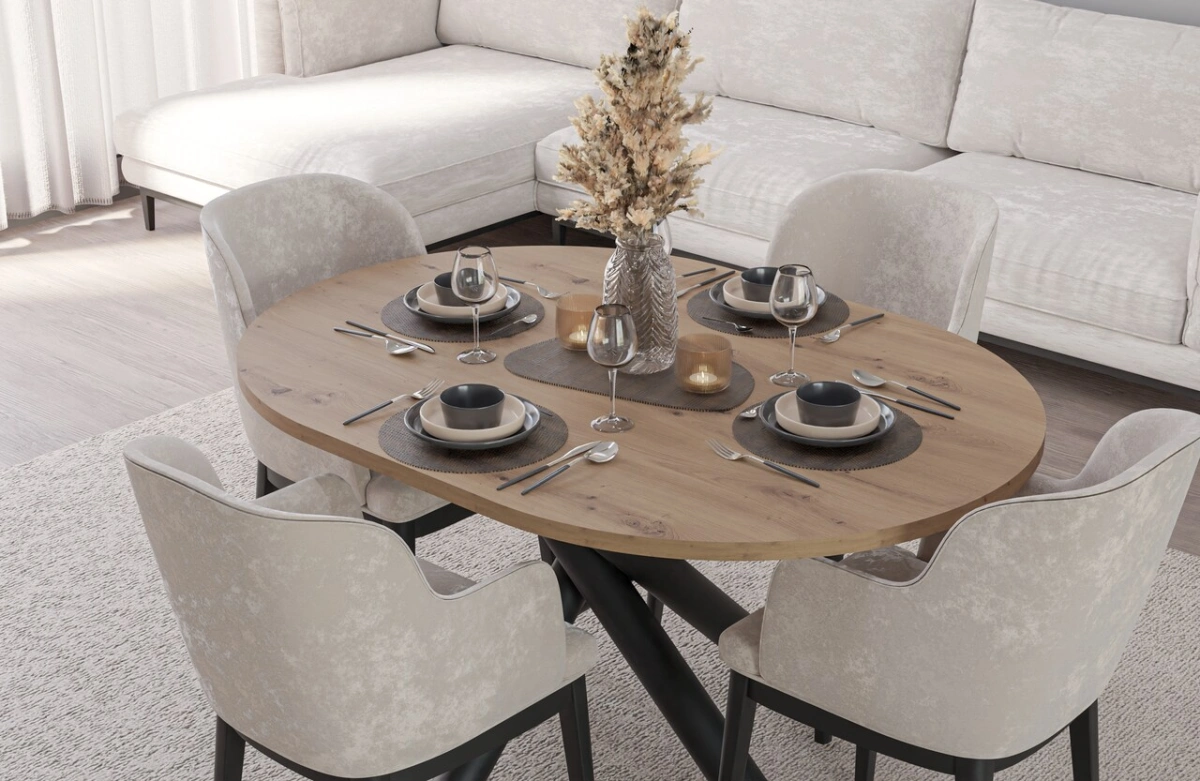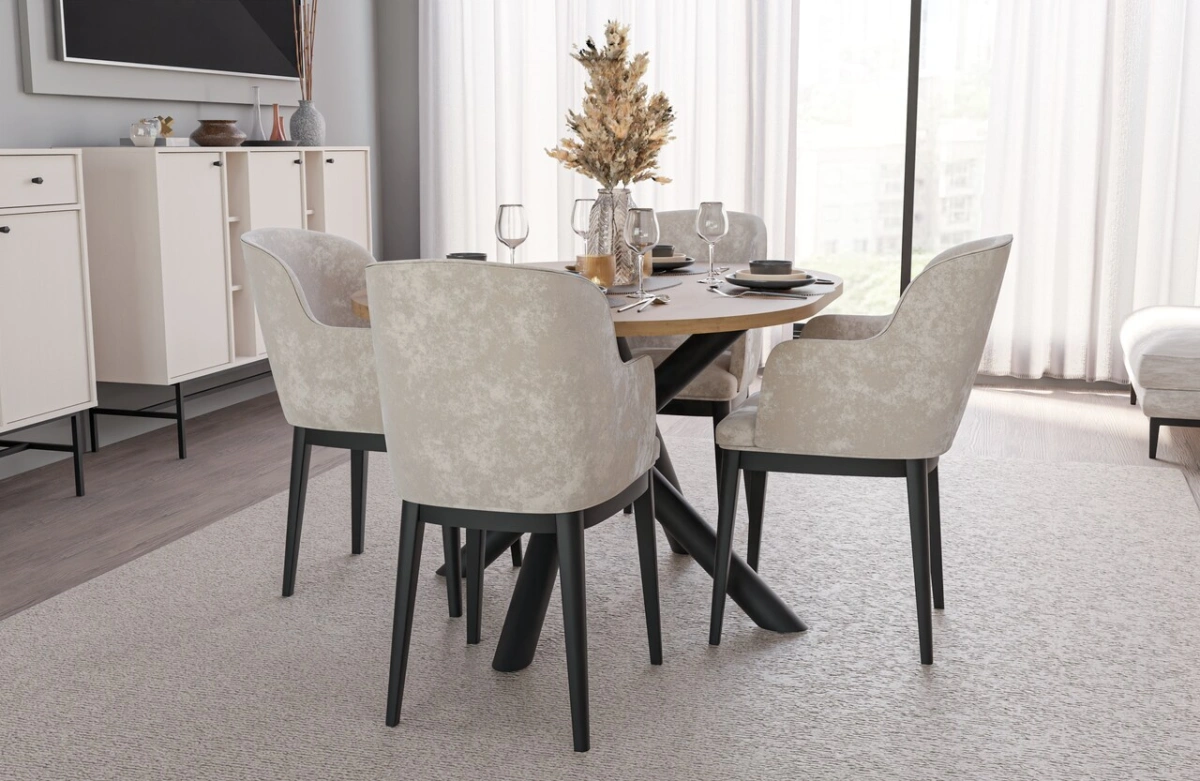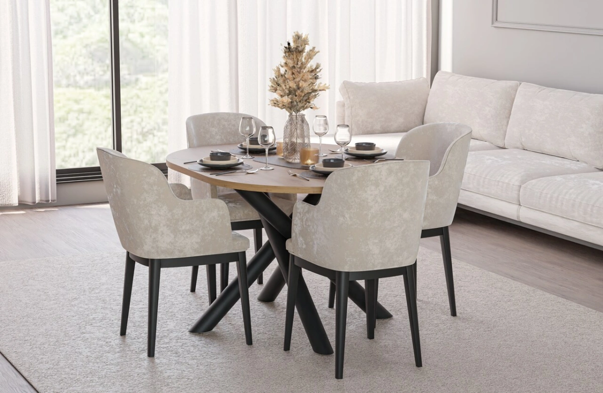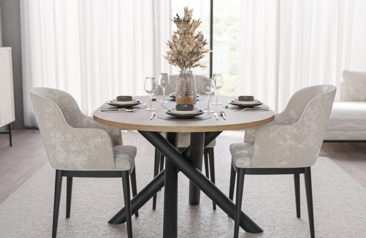 A collection of modern dining tables, the tops of which are set on decorative metal spider legs, characterized by a geometric, branching shape. Besides their aesthetic appeal, this leg shape guarantees solid support for even large tabletops. Combined with a round or oval tabletop, available in four colors, the entire piece looks incredibly stylish and elegant. OSLO tables are perfect for rooms decorated in a modern, minimalist style, but also industrial, glamorous, or loft-style.