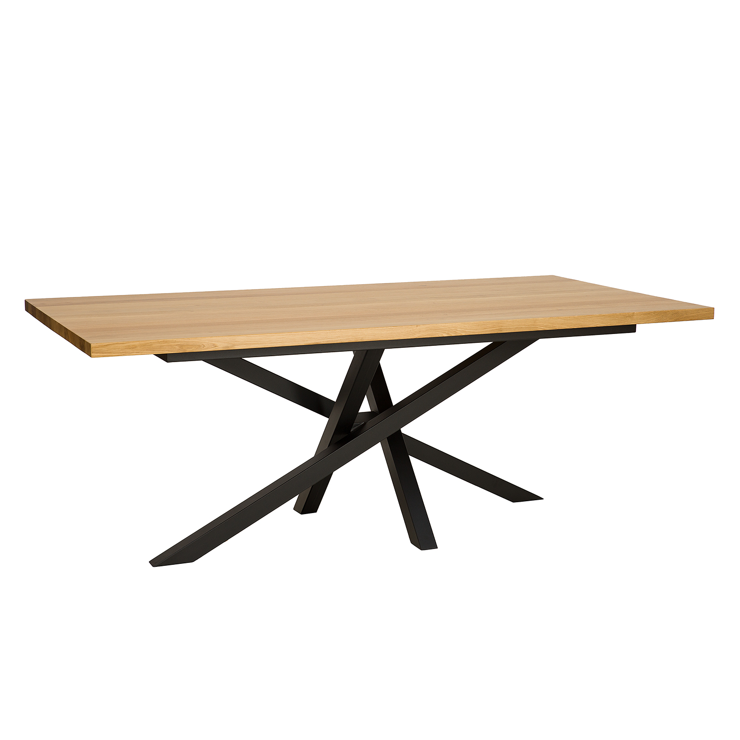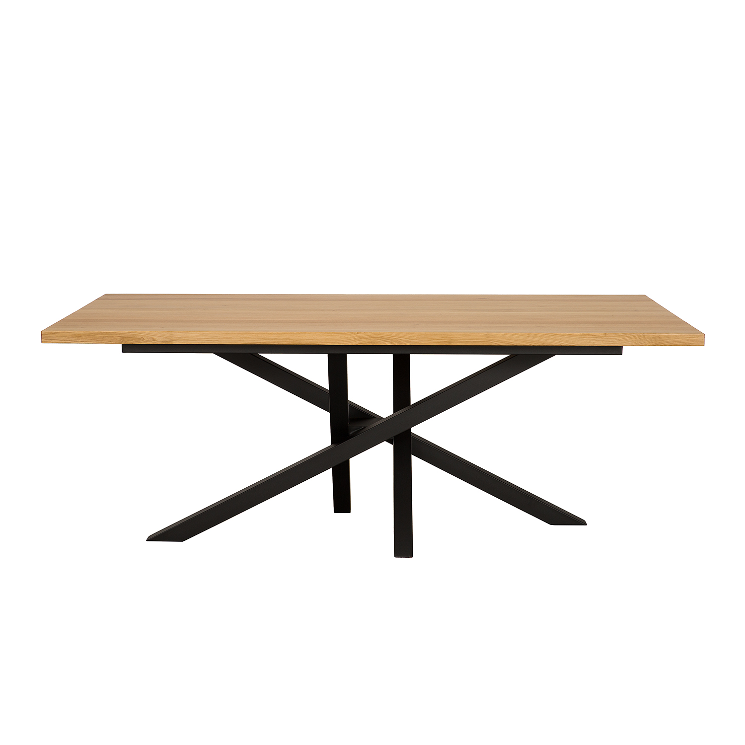 The exceptionally original metal base with intersecting spider legs creates a dynamic and modern look, making the ST377 oak table a decorative focal point in a dining room or living room. This table is perfect for those seeking a modern alternative to classic interior design.