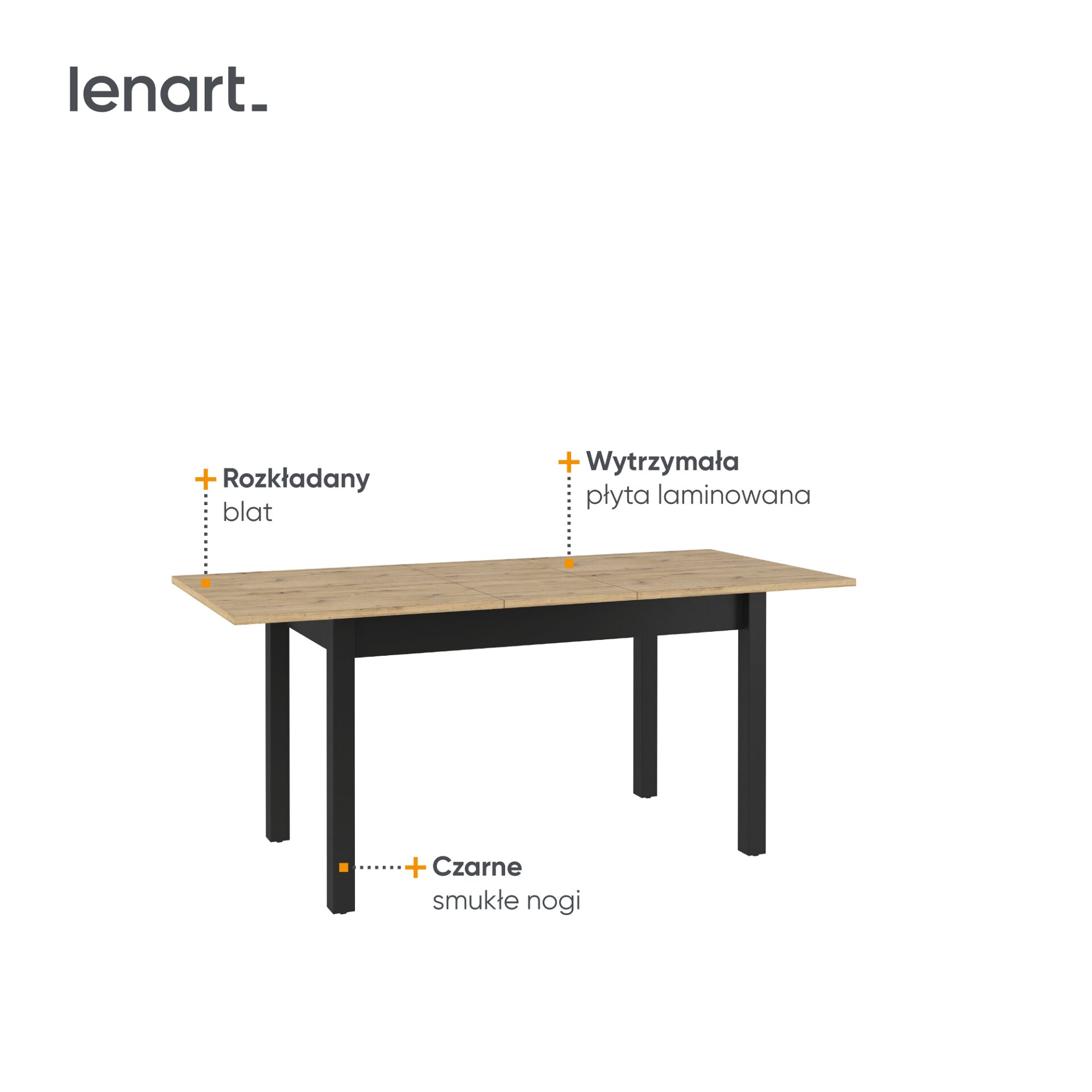 Model: QA-10 Color: Artisan Oak / Black Dimensions: Width: 146cm Height: 80cm Depth: 84cm Basic information: Shape name: QA-10 Collection name: QUANT Shape index: QA10DAC Color: Artisan Oak / Black Furniture type: Table Width: 146 cm Height: 80 cm Depth: 84 cm Shape weight: 46 kg Additional dimension 1: 186 Assembly: Requires assembly Collection style: Modern Interior type 1: Living room Fittings: Foot/leg: Slide with nail Design: Extendable tabletop: Yes Dimensions after extension: 186cm Tabletop shape: Rectangular Number and dimensions of inserts: 1; 40/84cm Table runner: Metal Important: This table is made to order. Cancellation is not possible after 48 hours of placing your order. Please shop carefully.